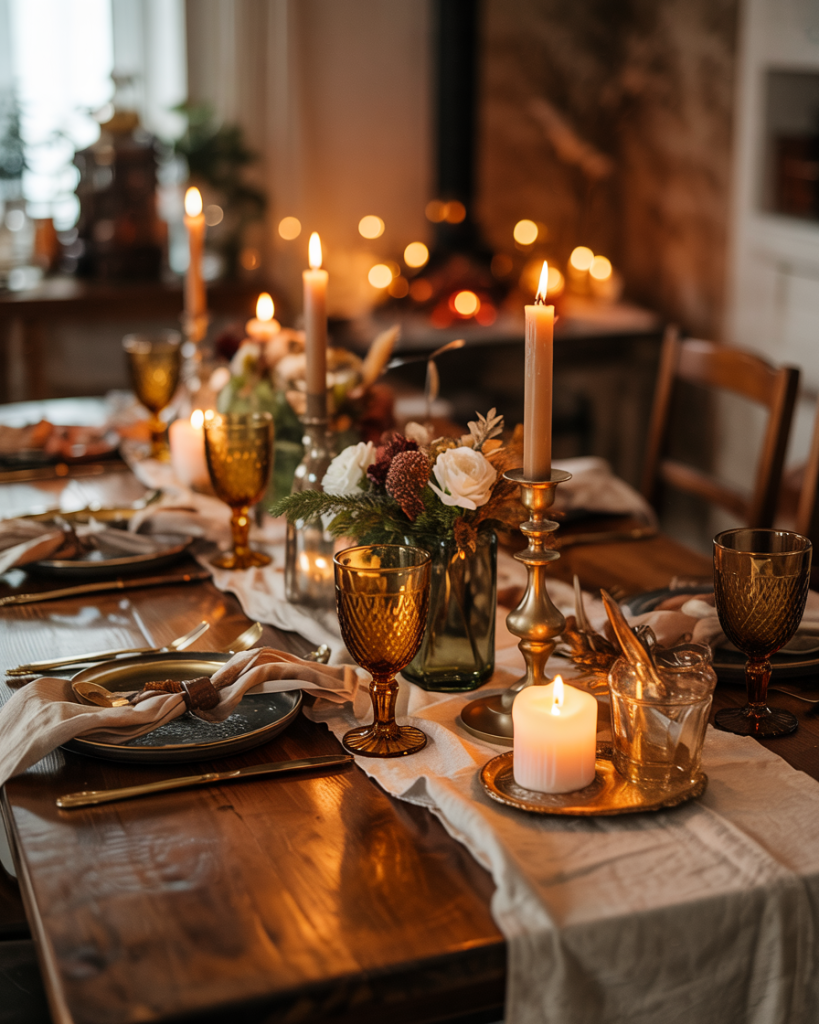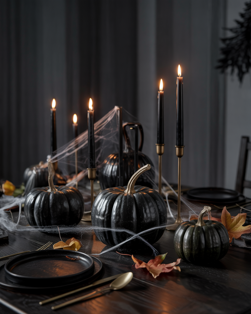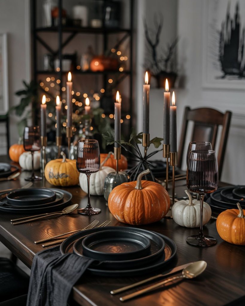 A bold Halloween A dark wood setting leans into candlelight, charcoal linens, and matte pumpkins for a chic—not cheesy—October dinner. Think Edgar Allan Poe meets Restoration Hardware. I hosted a party once with only black taper candles, and everyone swore the food tasted better because the atmosphere felt mysterious. Use dried branches instead of plastic décor for grown-up spookiness.