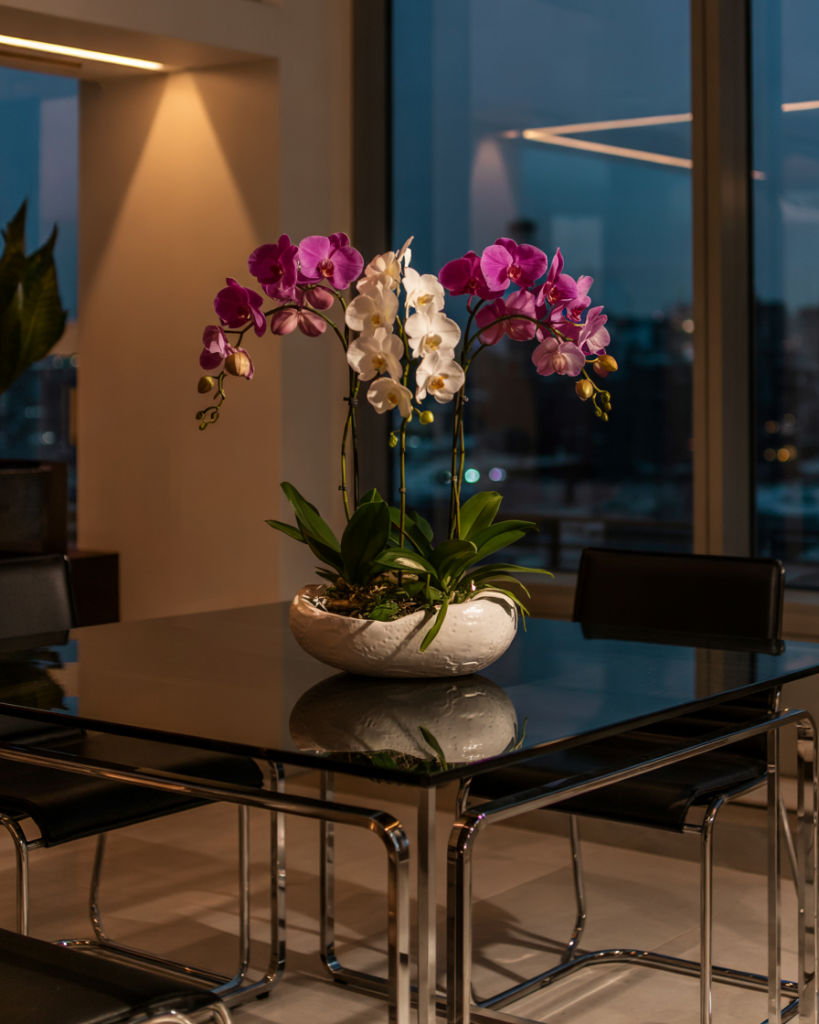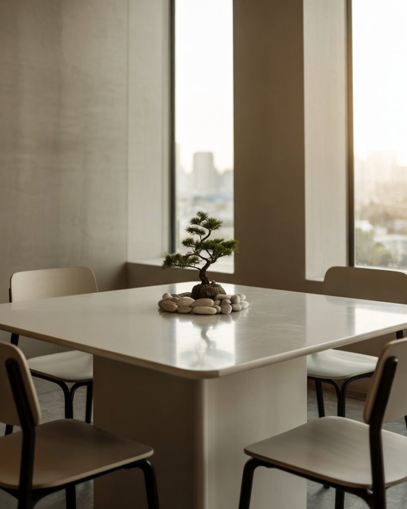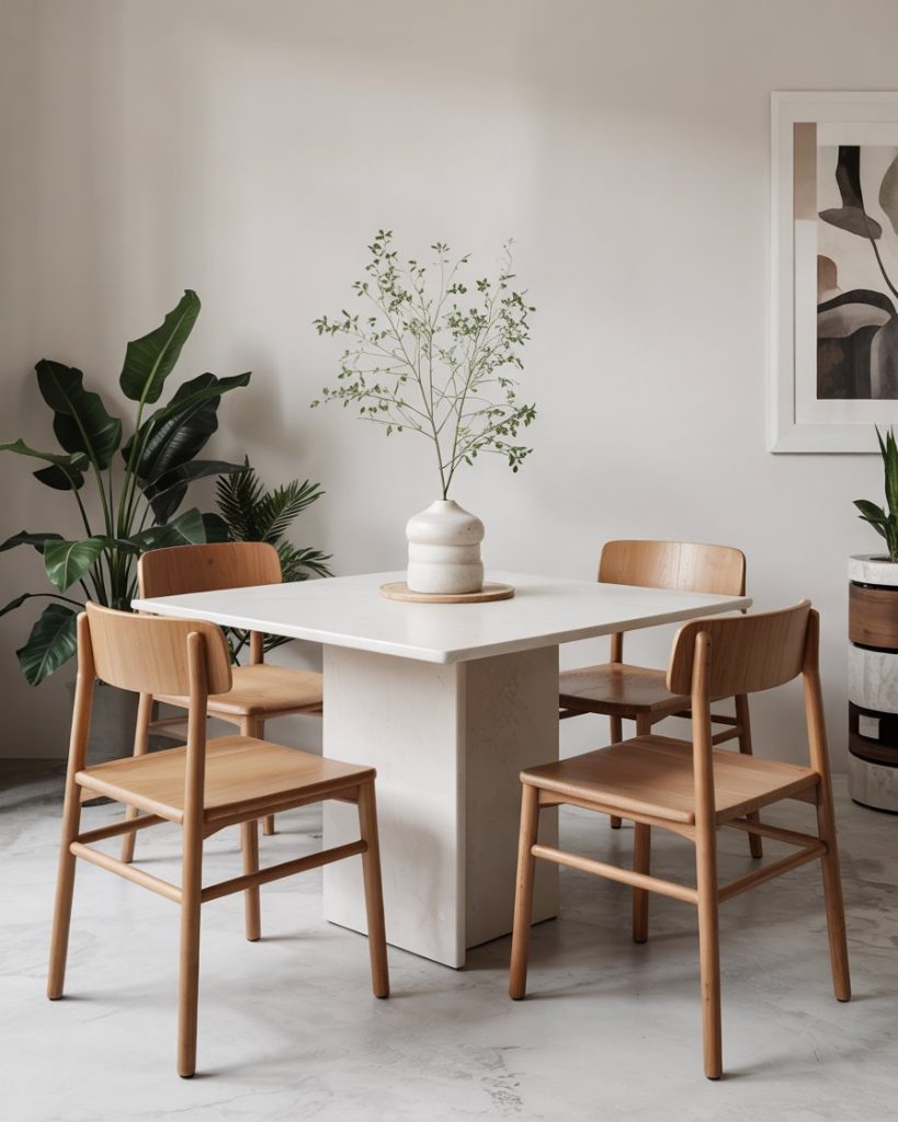 A bold square white setup thrives in compact condos where symmetry calms the eye. Four chairs, four placemats, and one bonsai or stone bowl in the center—nothing extra. Japanese-inspired restraint turns meals into mindful pauses instead of rushed refueling. The square form also fits neatly into corners, freeing up traffic paths in small kitchens.
