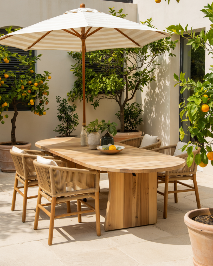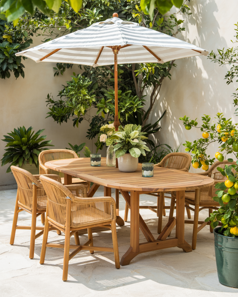 A bold outdoor oval wicker or teak table surrounded by rattan chairs makes the backyard feel like a boutique hotel brunch spot. Add citrus trees in planters and striped umbrellas for instant escapism. Gardenista says curved shapes resist harsh wind lines and feel more organic outdoors, blending better with garden paths and patio stones.