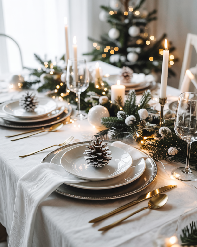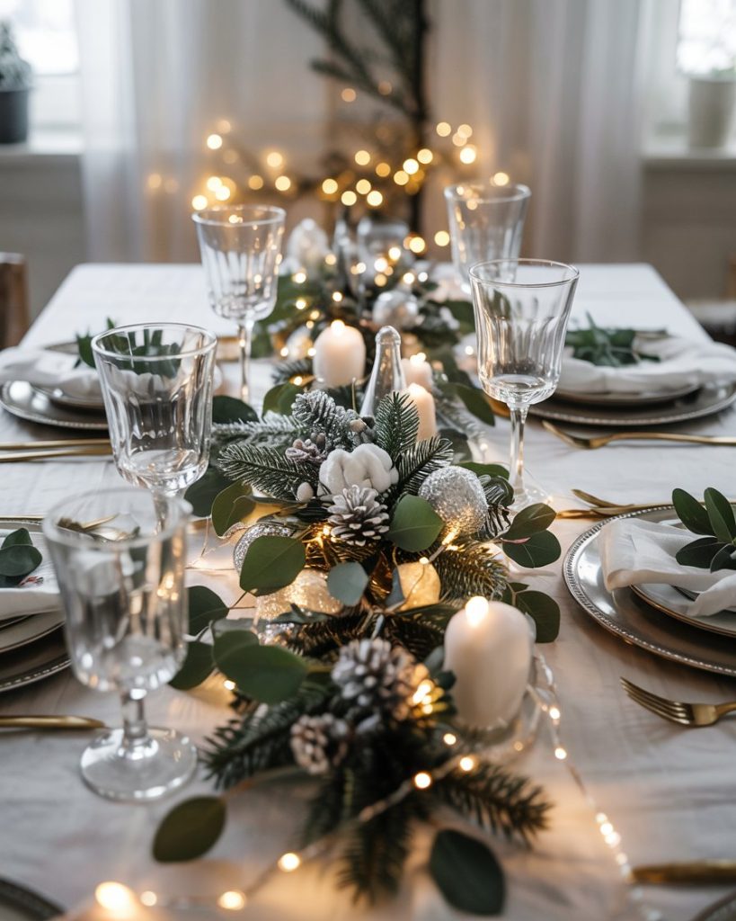 A striking White Holiday theme combines frosted glass, pale cutlery, and silver eucalyptus to create a snow-blanketed look without the use of fake glitter. From New Year’s Eve to winter birthday celebrations, this palette is appropriate and especially lovely under warm string lights. Martha Stewart’s team often uses stacked white desserts to mimic the layered look of fresh snowfall indoors—serene, unblemished, and mildly festive.
