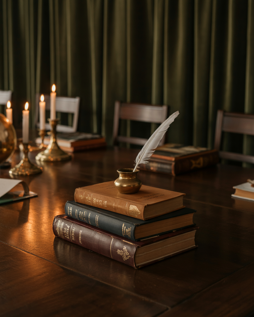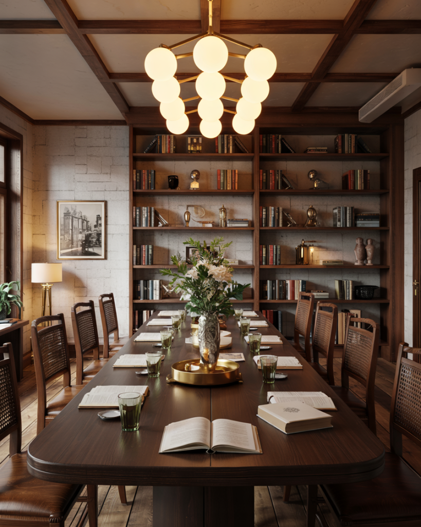 A striking Dark brown A long table set with vintage literature and brass decor, along with plaid napkins, transports the dinner to a university-club occasion. Ideal for someone who enjoys cigars, chess, or old hardcover classics. I once saw a host use stacked novels as risers for casseroles—very practical and poetic. This look thrives in paneled rooms or homes with deep wall colors.