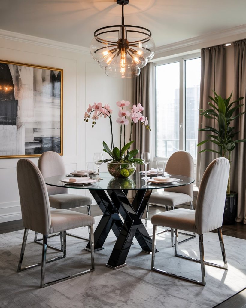 A striking black glass combo—glass top, black frame—brings a clubhouse-to-penthousevibe. For balance, use smoked glass tumblers, silver flatware, and a single white orchid. Design blogs delight in this combo, as the slanted glass captures illumination and the reflections double the sparkle.