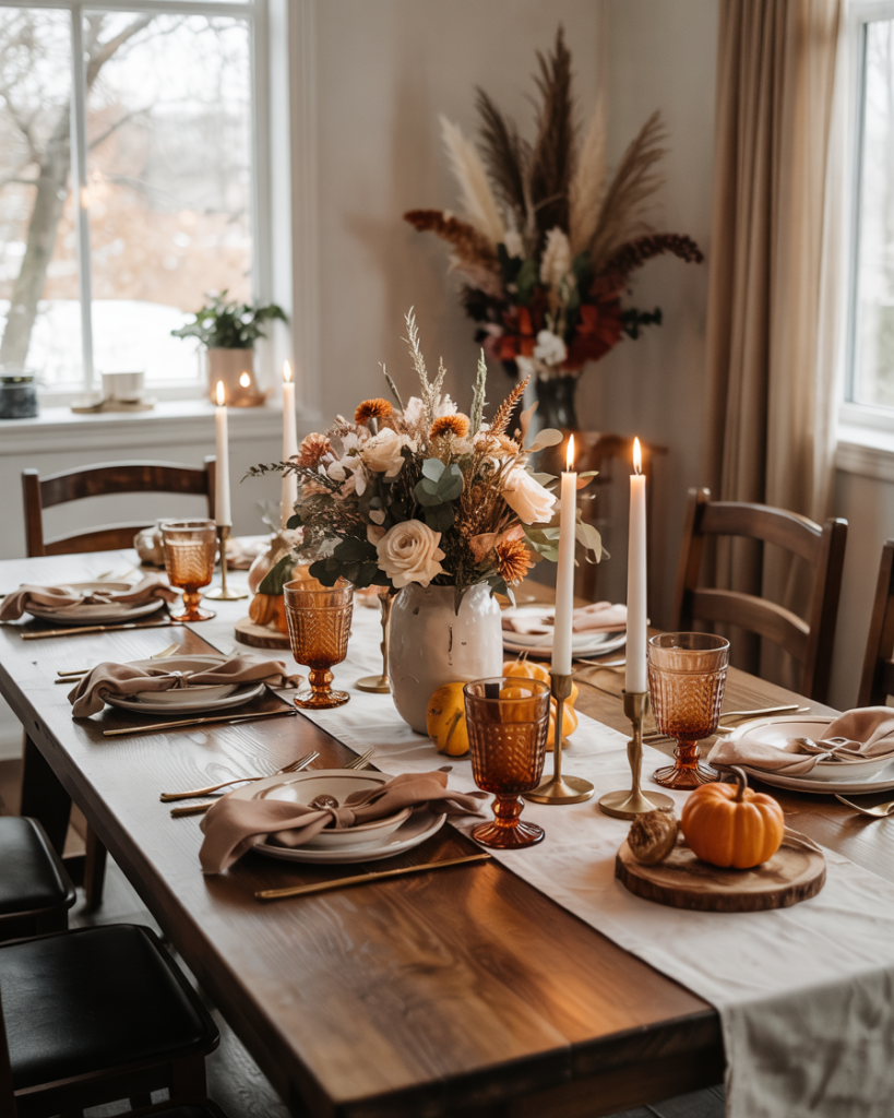 A bold Thanksgiving The rectangle table invites passing bowls, sharing stories, and lingering over pie. Layer vintage linens, amber glassware, and dried leaves for a nostalgic harvest mood. My neighbor still irons her grandmother’s tablecloth every November, wrinkles and all, proving that sentimental pieces beat store-bought perfection. Rectangle shapes also seat more people comfortably, which holiday hosts always appreciate.