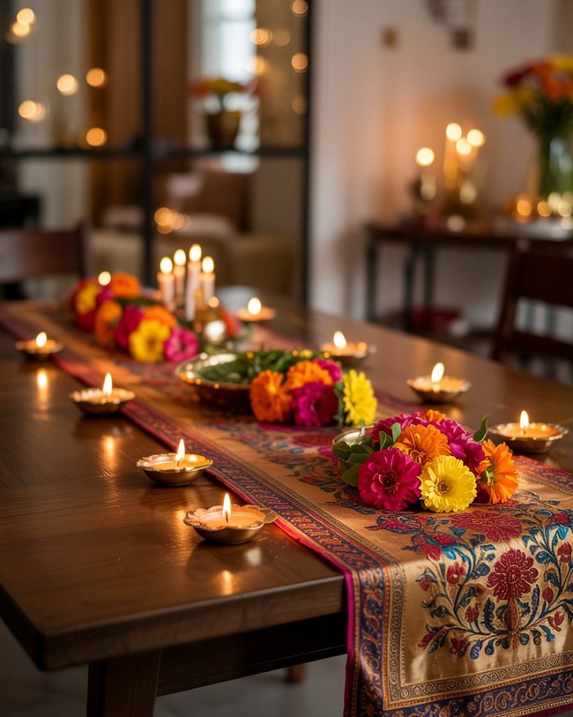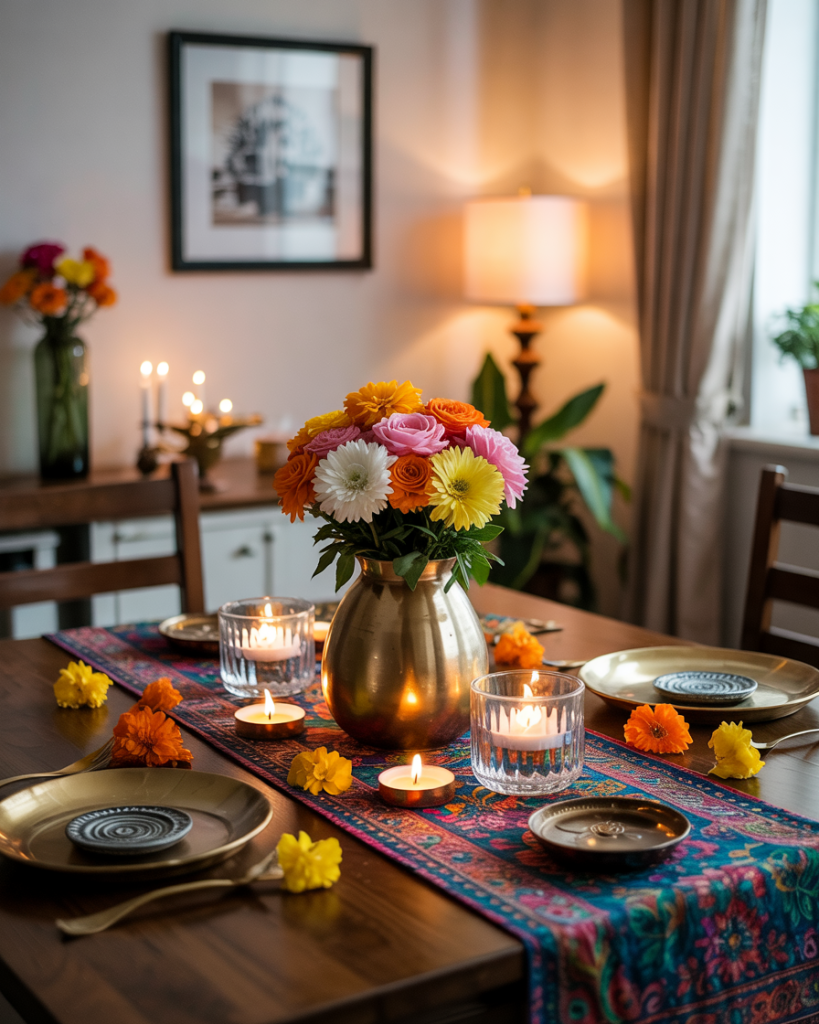 A bold Diwali Indian home table mixes marigold flowers, brass plates, and patterned runners to honor tradition while feeling fresh. Floating candles in shallow bowls create ambient sparkle without blocking conversation. Designer Shabnam Gupta often blends heritage patterns with soft neutrals, proving cultural décor can be both rooted and modern. Serve mithai on small ceramic trays for a sweet final touch.