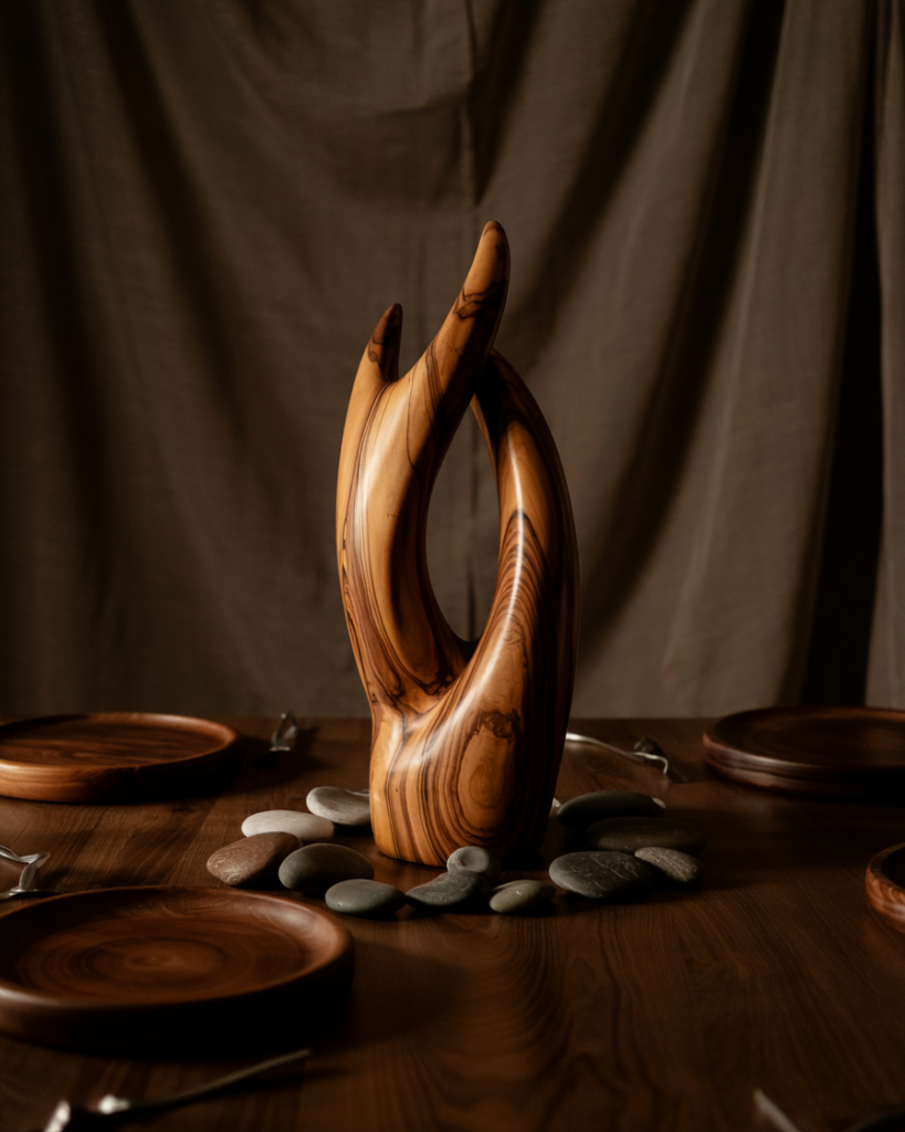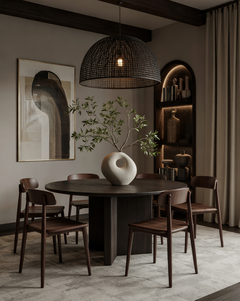 A bold dark wood centerpiece approach relies on one sculptural focal point instead of many mini trinkets. Think of a ceramic bust, a twisted branch, or an oversized bowl of pears. Design Milk calls this “quiet maximalism,” where one confident object replaces visual noise. The richness of oak or mahogany provides a gallery-like backdrop, letting the centerpiece feel curated rather than cluttered.