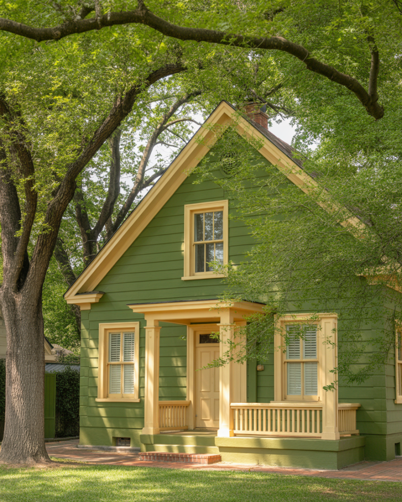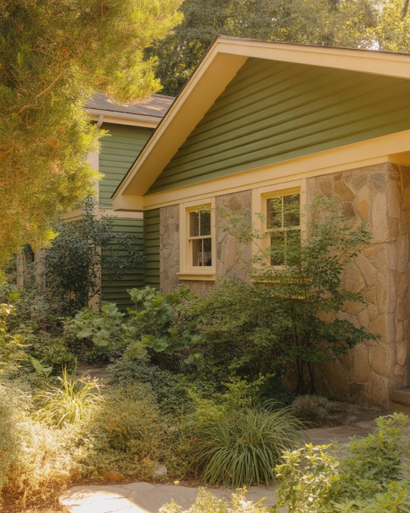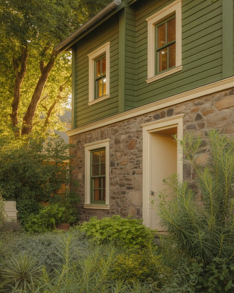 Layering olive green with stone elements brings out nature’s texture in a home’s exterior. Olive is earthy yet stylish, and stone enhances its grounded personality. Add cream trim for contrast and balance. This combination feels organic, like it belongs to the landscape itself—a favorite among designers in 2026.
