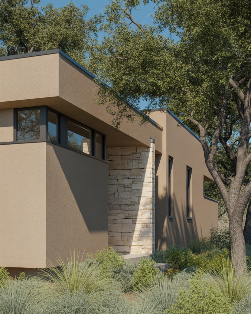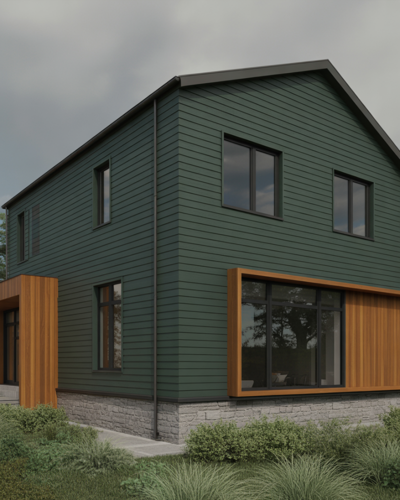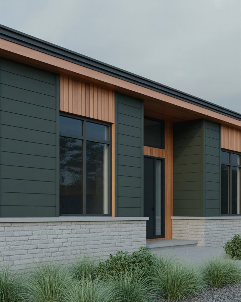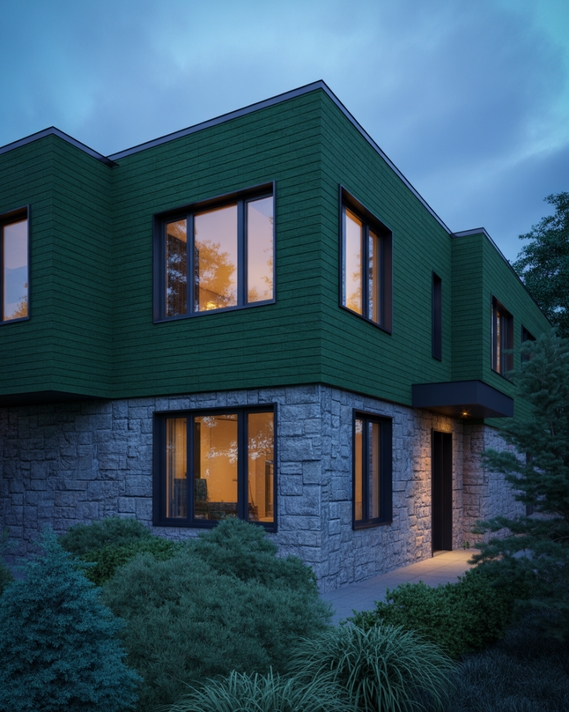 The new generation of moody exteriors embraces dark green as a sophisticated statement. From forest to olive green, these hues create depth and richness, especially when paired with light stone or natural wood siding. Use dark green for shutters, doors, or entire facades for a luxurious, grounded aesthetic. Designers note this trend as part of the growing return to nature-inspired exteriors.