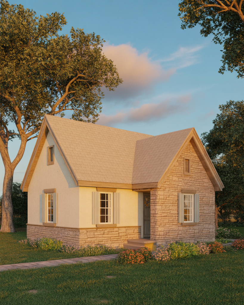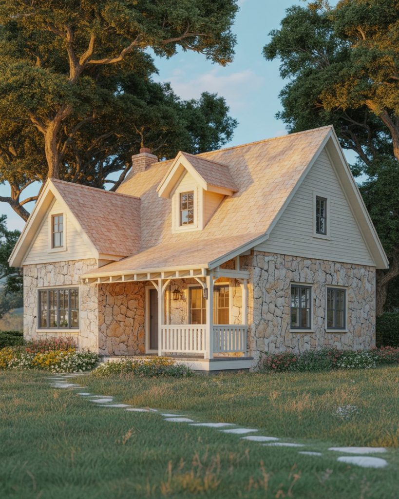 Blending cream with stone textures offers a warm, rustic charm. This palette, ideal for cottages and traditional homes, adds coziness while maintaining elegance. The combination of cream siding, a light brown roof, and a natural stone base feels timeless and inviting—like a European countryside villa.