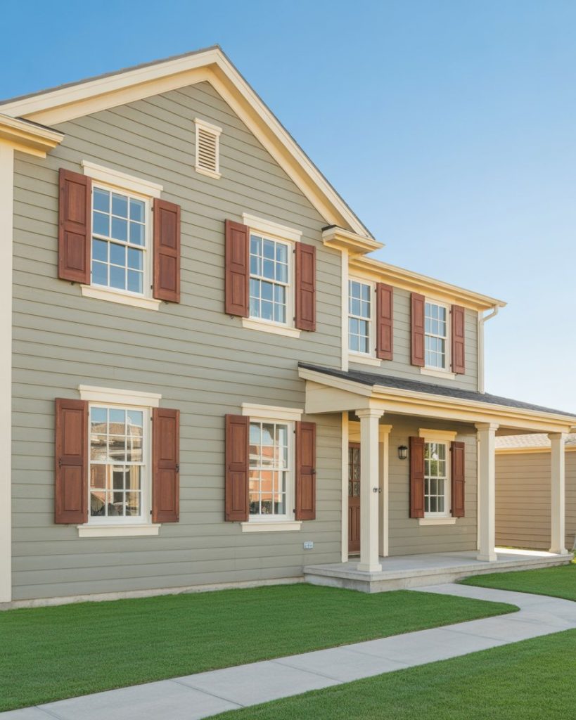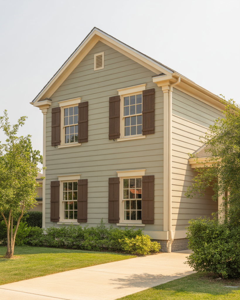 When brown meets greige, the result is understated sophistication. This combination works for both modern and traditional architecture. Greige walls with brown shutters or a brown base add depth without darkness. It’s a safe but stylish choice for homeowners who want neutrality with personality.