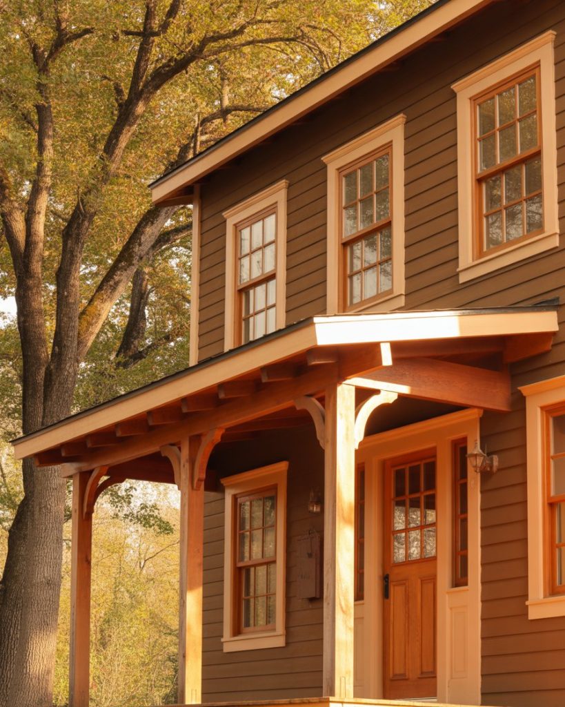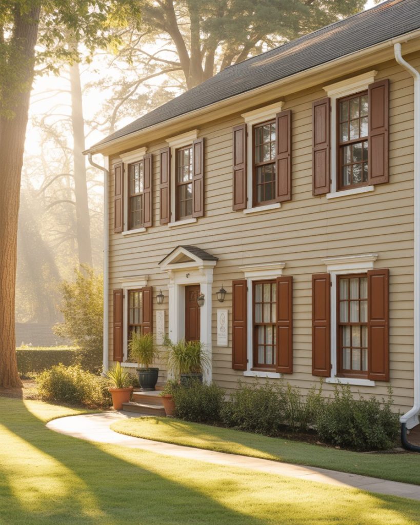 A grounded earth tone favorite for 2026, brown paired with beige trim adds warmth and timelessness. Whether it’s dark chocolate siding or lighter wood brown, the effect feels organic and welcoming. This classic pairing highlights craftsmanship and complements natural surroundings.