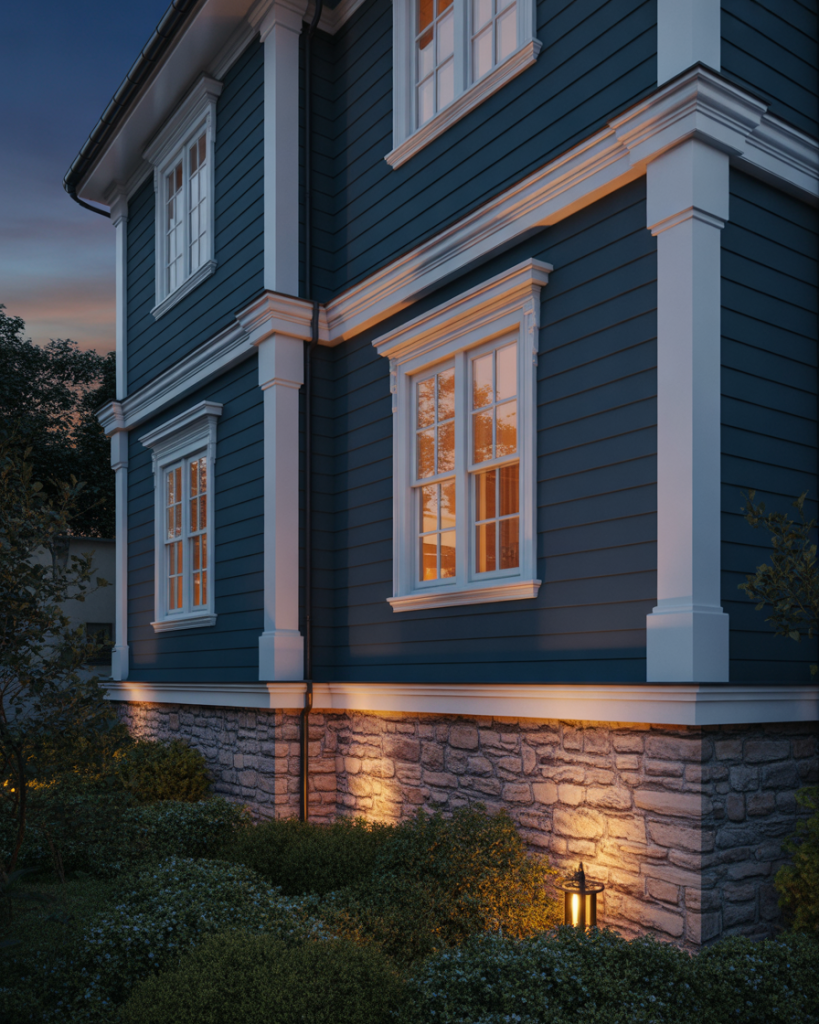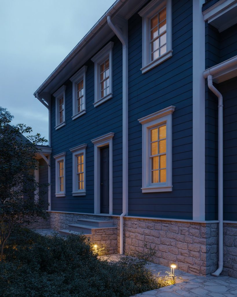 Few exteriors make as bold a statement as dark blue. Deep navy or midnight blue conveys elegance and confidence, especially with crisp white or cream details. Paired with stone bases or brown wood accents, dark blue brings modern sophistication to colonial, craftsman, or farmhouse styles. Home designers predict this bold blue revival will dominate 2026 facades.
