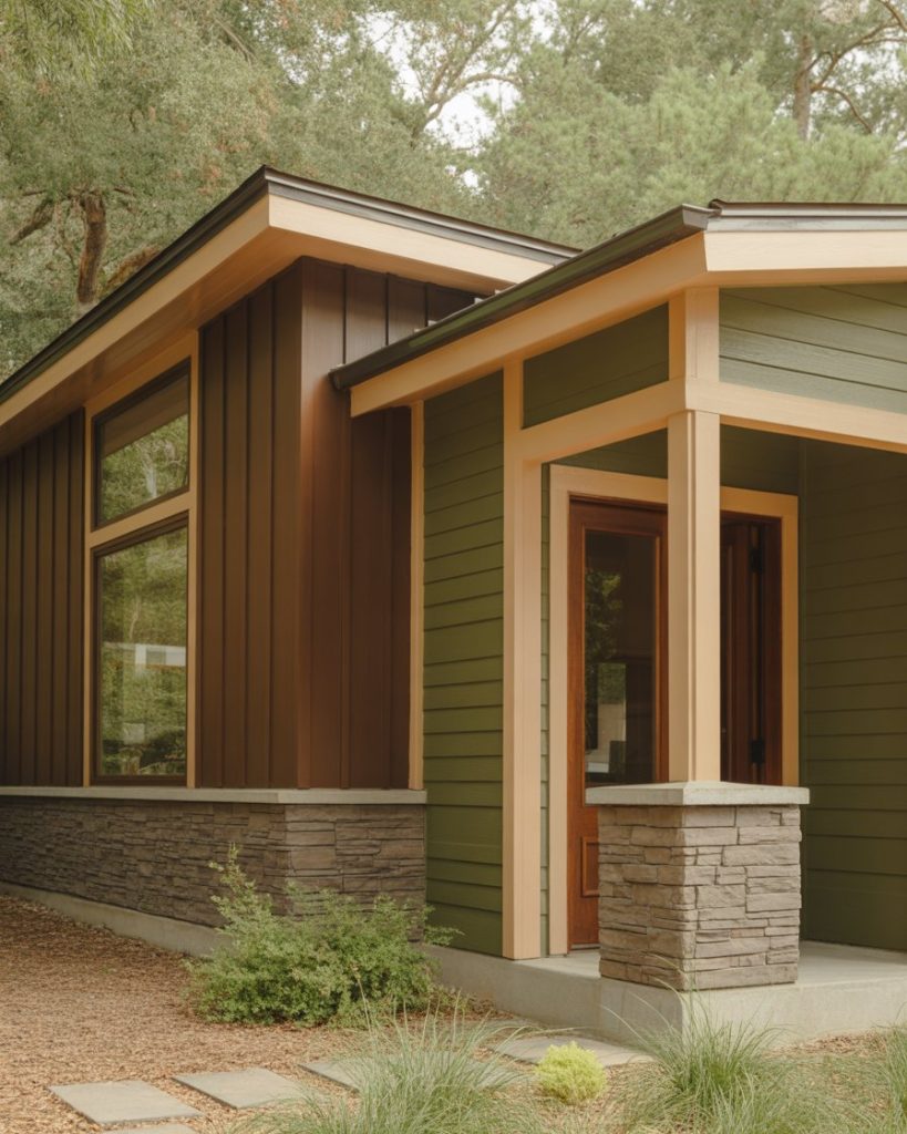 For a modern twist on nature-inspired design, olive green makes a refined exterior color choice. It bridges green, earth tone, and gray, offering depth without overwhelming the architecture. Trim in beige or cream keeps it crisp and approachable. This palette thrives in wooded or suburban settings where natural light enhances its warmth.