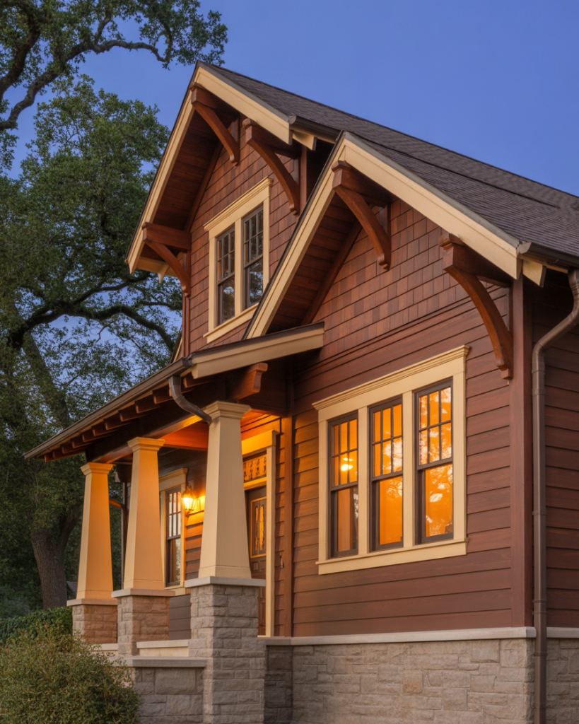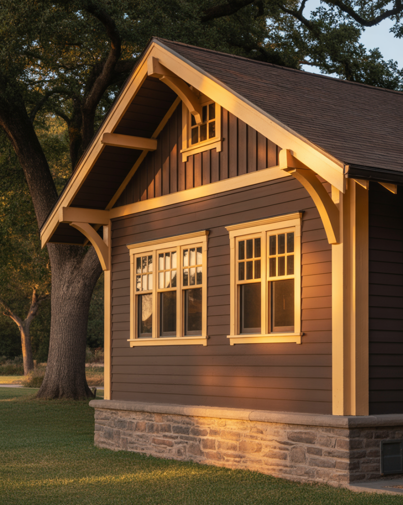 A dark brown exterior with stone elements feels classic and strong. Perfect for rustic or lodge-style homes, this color scheme adds dimension and durability. Combine dark brown siding with cream or greige trim to prevent heaviness. As 2026 trends lean into natural finishes, dark brown returns as a symbol of comfort and authenticity.