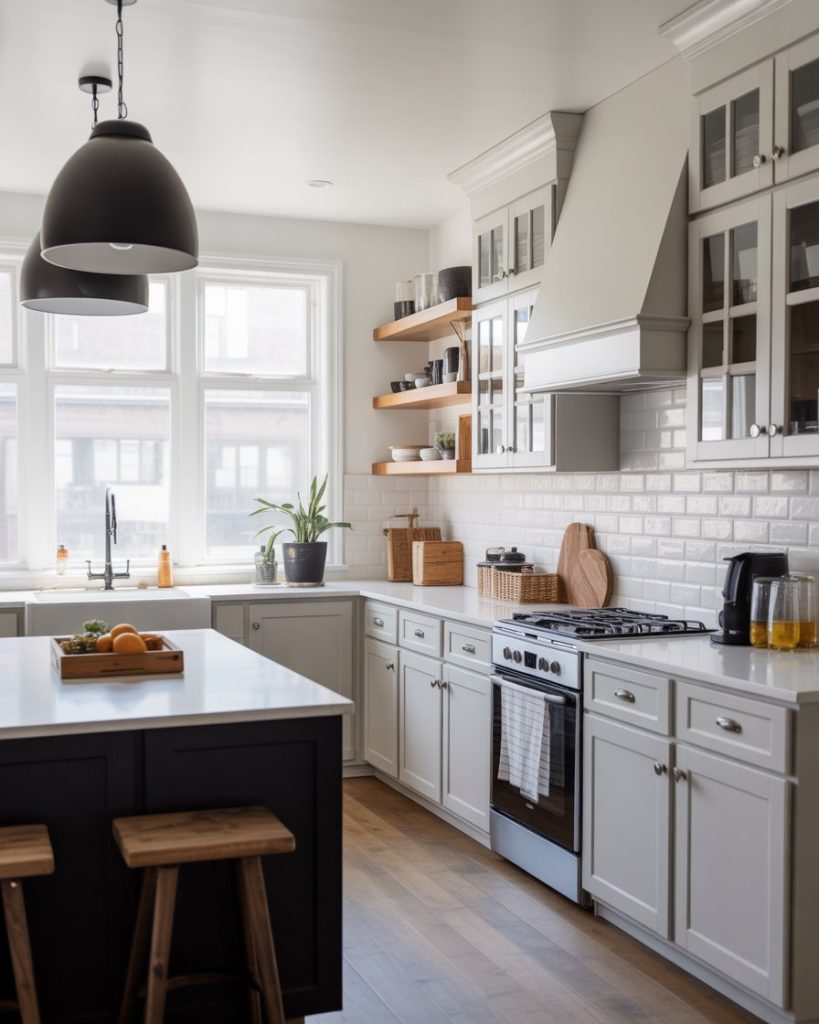 The white modern farmhouse kitchen is the epitome of serenity, yet it has boldness as well because of the black and white contrast. The white shaker cabinets brighten the room, while the matte black handles, stools, and light fixtures add drama to the simplicity of the space. The modern style keeps things sleek, but the layout is practical and welcoming for small spaces. This approach is fresh and timeless at once, blending minimalism and farmhouse warmth, proving applicable to homeowners who adore both styles.