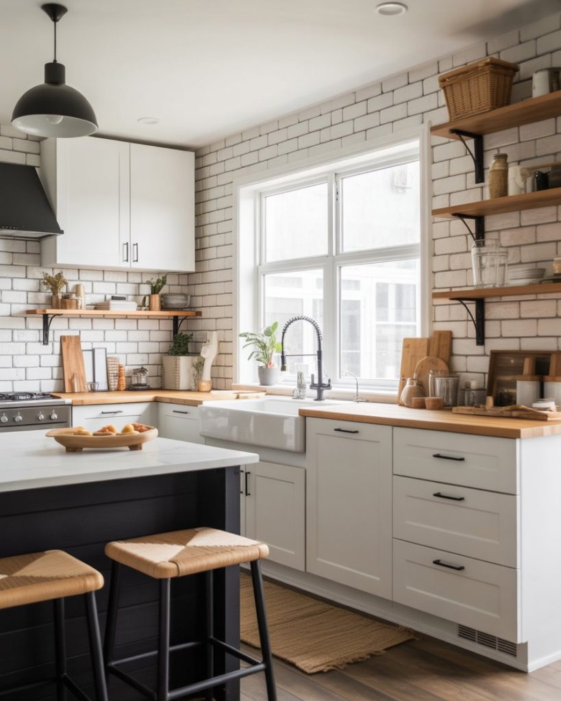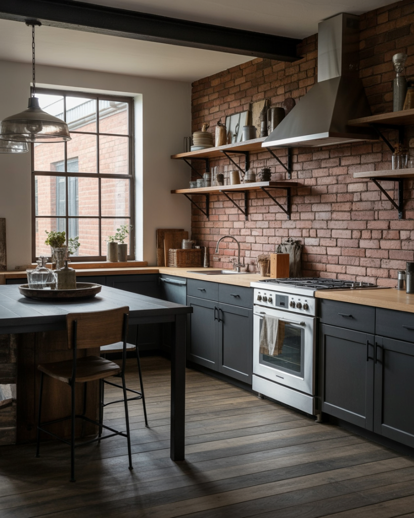 A moody industrial farmhouse kitchen merges raw materials with classic coziness. Exposed brick, black steel frames, dark wood counters, and pendant lights evoke urban charm. The modern balance comes from sleek appliances and minimal clutter, while reclaimed wood or open shelving keeps it farmhouse-honest. Perfect for city dwellers who crave character, this design feels bold and grounded, transforming the kitchen into a space full of energy and personality.