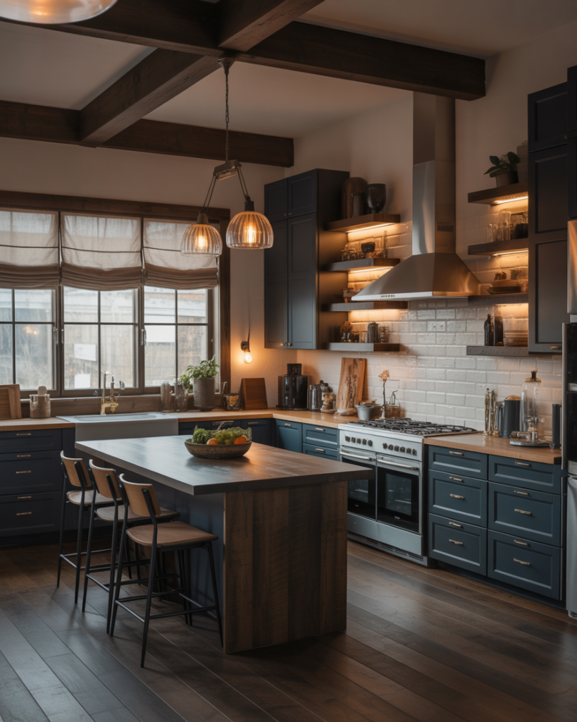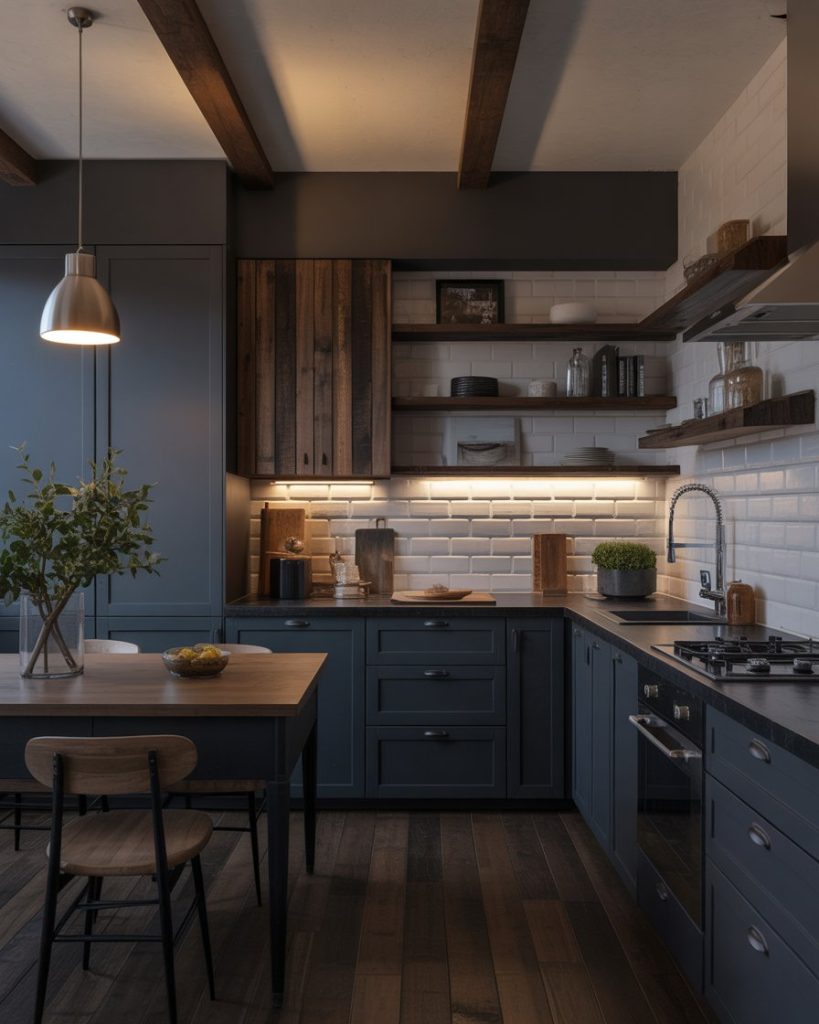 A moody farmhouse kitchen embraces depth and drama through color and contrast. Deep navy, forest green, or charcoal cabinets set a sophisticated modern tone, while rustic wood accents and soft lighting keep the space grounded. The effect is intimate yet bold, offering the warmth of farmhouse style with the confidence of contemporary design. This trend fits perfectly for 2026, when people want cozy spaces that still feel stylish and elevated.