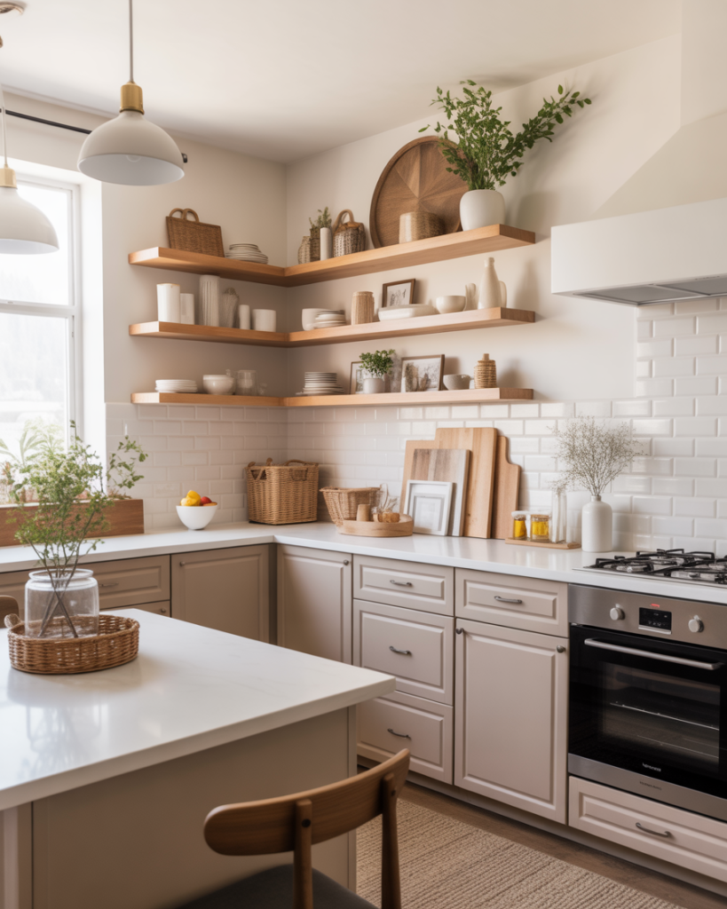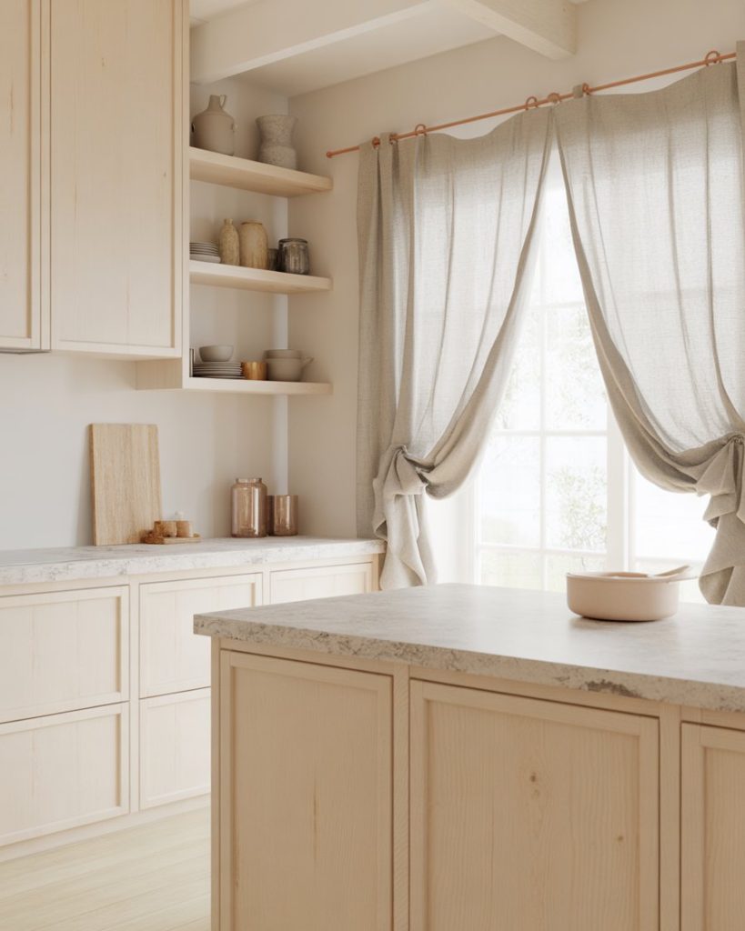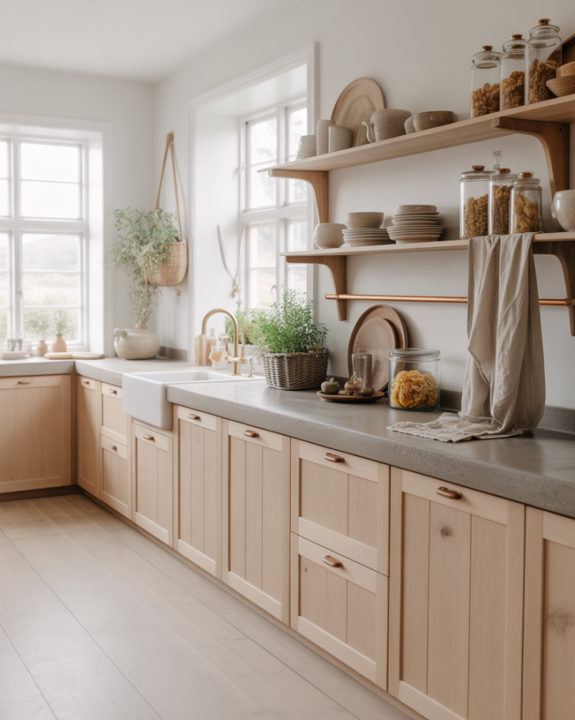 Drawing from Nordic design, the simple Scandinavian farmhouse kitchen is calm and minimal yet rich in texture. White oak cabinetry, open shelves, linen curtains, and natural stone surfaces define the look. The palette stays light and airy, ideal for small spaces or anyone craving visual peace. Combining modern functionality with rustic honesty, this design shows how less truly can be more, turning your kitchen into a haven of clarity and warmth.