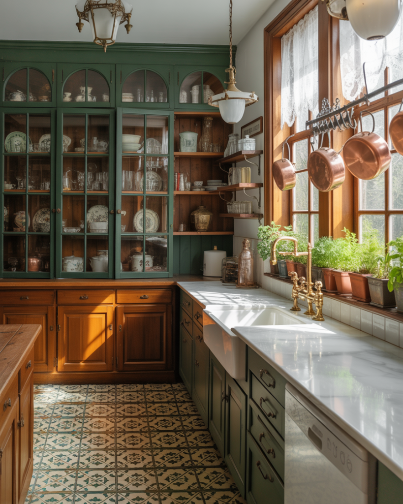 The Victorian farmhouse kitchen returns in 2026 as a statement of ornate charm meeting modern ease. Picture glass-front cabinets, patterned tile floors, marble counters, and antique-style brass fixtures. The vintage influence shines through, but technology and layout remain up to date. This balance of old and new creates a kitchen with character and heart—where every meal feels a little ceremonial and every corner carries a touch of timeless grace.