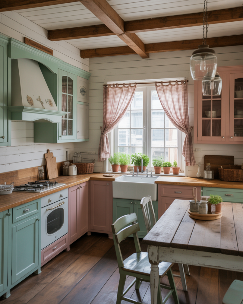 A colorful cottage farmhouse kitchen bursts with joy and creativity. Painted cabinets, floral curtains, patterned tiles, and open shelving make the space feel playful yet nostalgic. Mixing soft blues, greens, and yellows keeps it balanced while maintaining that country coziness. Perfect for families who love warmth and personality, this kitchen is the heart of a happy home—spirited, artistic, and full of light.