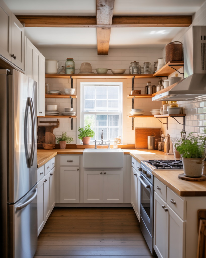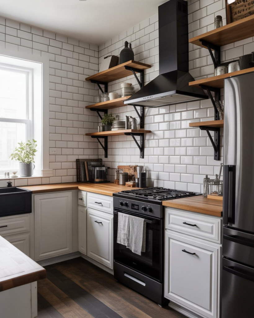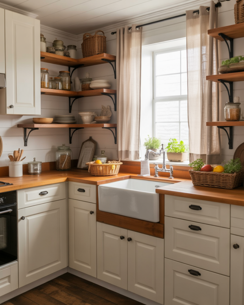 Even tiny kitchens can shine with rustic charm and smart design. In small spaces, lighter colors, open shelving, and compact appliances make a world of difference. A farmhouse sink, folding breakfast bar, and vertical storage maximize function while keeping a cozy vibe. Add touches like a reclaimed wood shelf or shiplap backsplash to introduce authentic texture. It’s proof that great style doesn’t need big square footage—just thoughtful details.