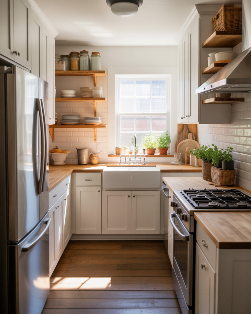 For city dwellers, the galley farmhouse kitchen makes efficient use of narrow layouts. Long counters on both sides, open shelving, and modern integrated appliances keep things functional yet rustic. Using light tones like white or pale wood prevents the space from feeling confined. The result is practical but full of charm—ideal for tiny apartments that crave a bit of countryside warmth amid the urban buzz.