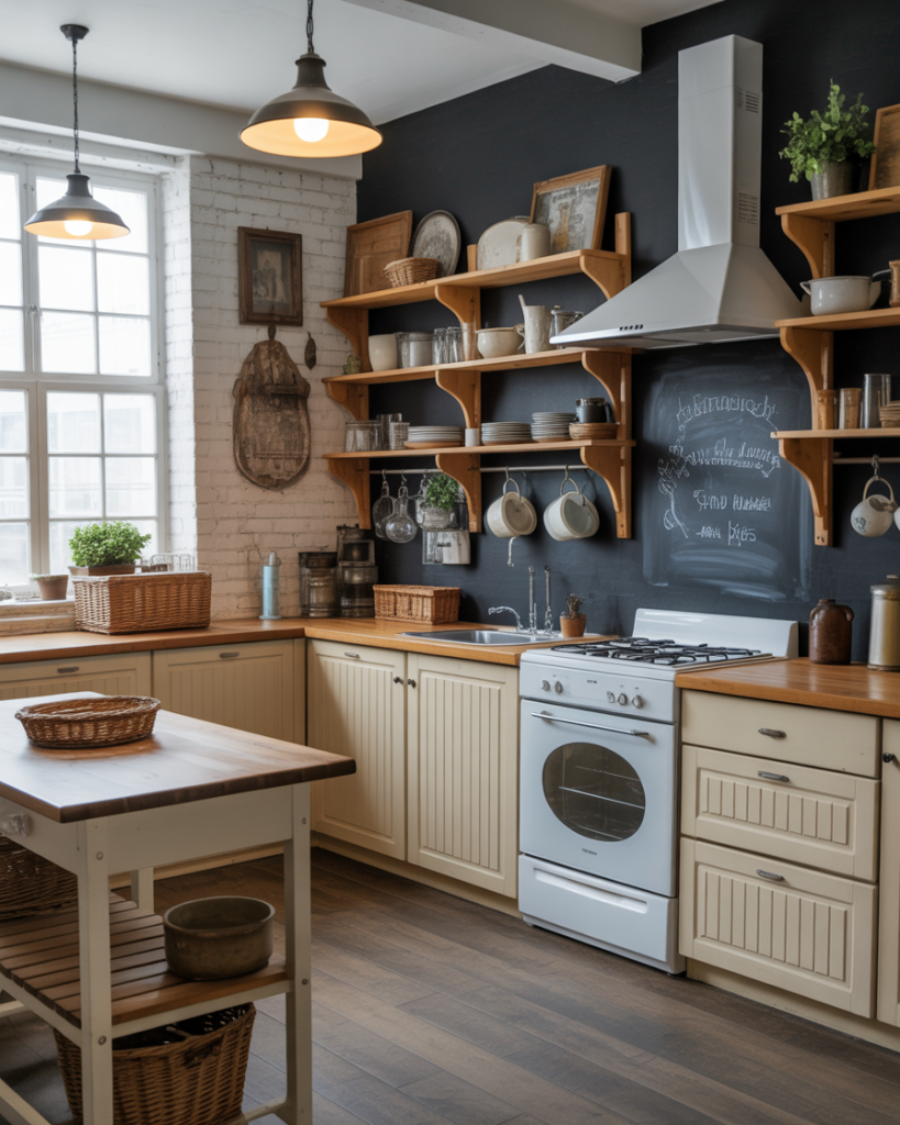 Inspired by old general stores, this vintage farmhouse kitchen evokes nostalgia with open shelves lined with jars, wooden counters, and enamelware. A chalkboard wall adds personality, while pendant lights bring a modern edge. It’s both budget-friendly and rustic and charming, inviting you to cook and create in a space that feels genuine and lived-in. This design suits anyone who loves blending history with practicality in a cozy home hub.