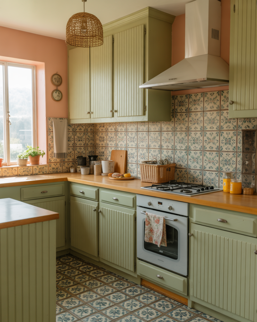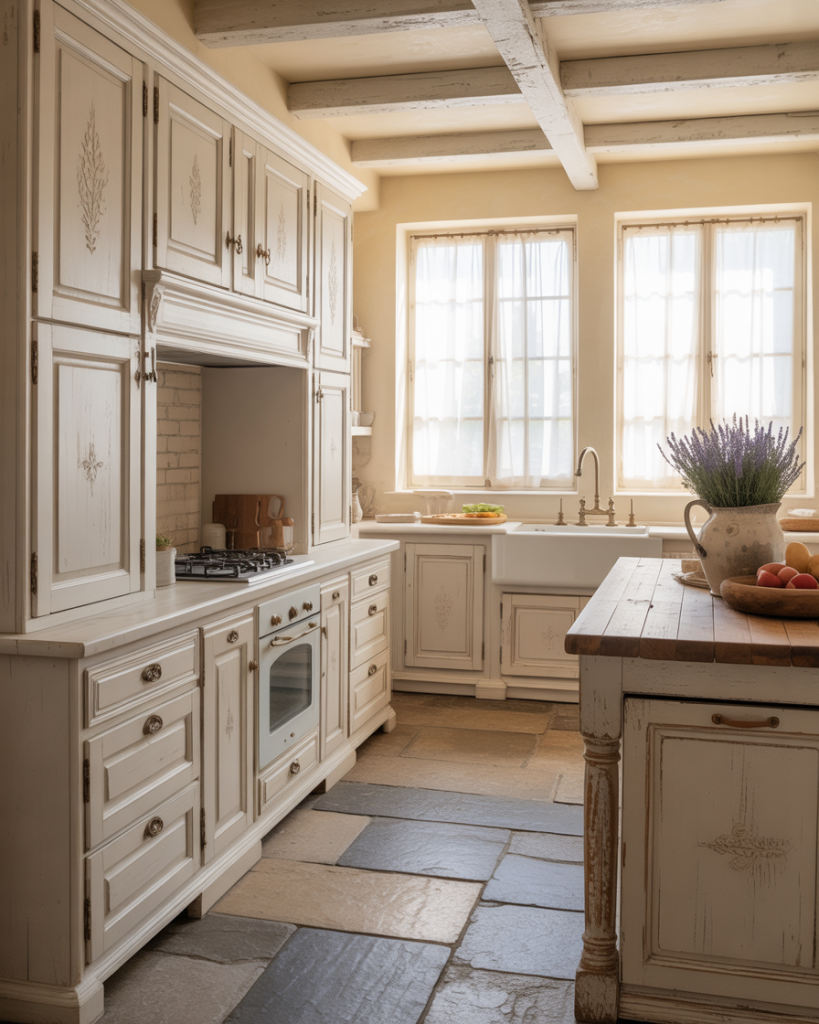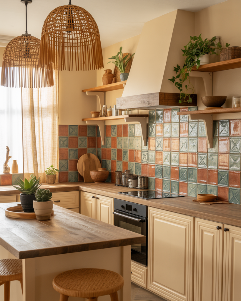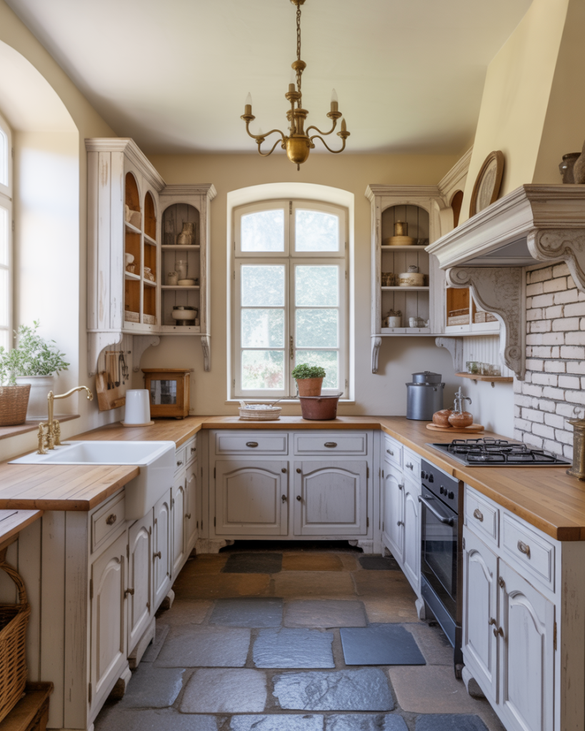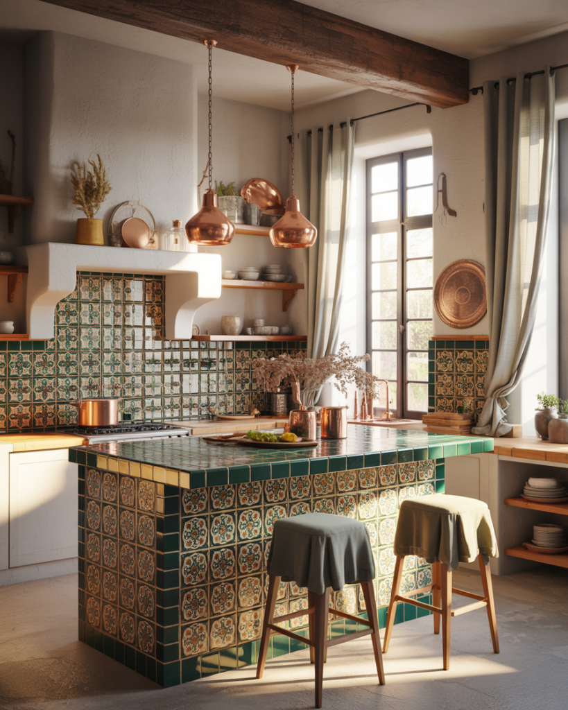 Blending French refinement and boho spirit, this idea creates a kitchen full of charm and creativity. White plaster walls, patterned Moroccan tiles, vintage copper pots, and linen textures merge sophistication with relaxed artistry. It’s perfect for homeowners who love travel, craftsmanship, and layered beauty. Elegant yet earthy, this fusion style defines 2026’s global farmhouse aesthetic.