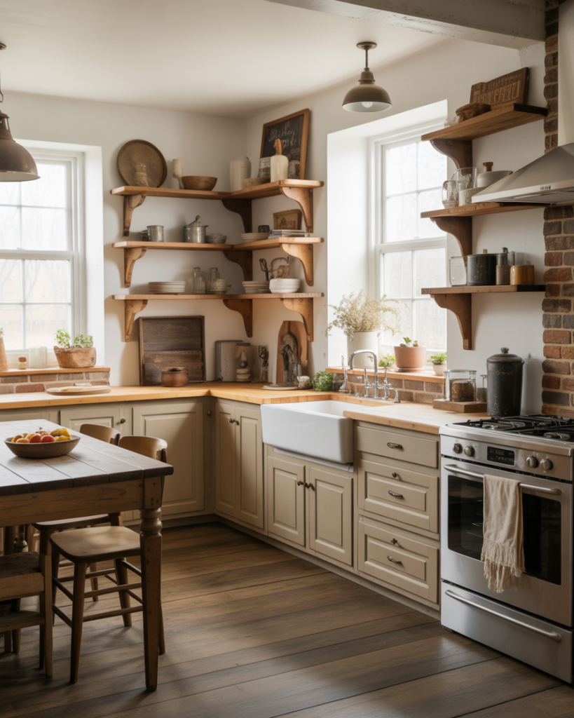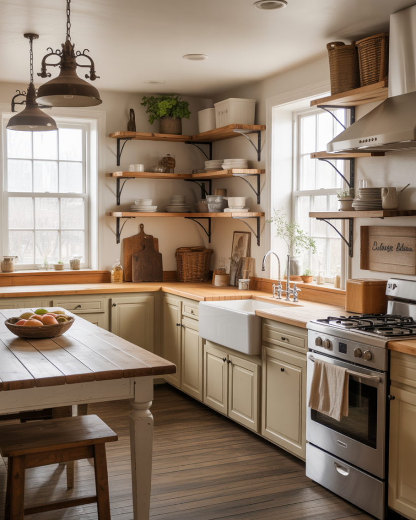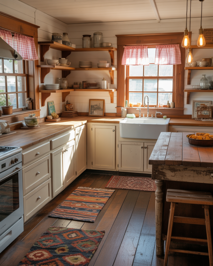 A rustic farmhouse kitchen concept can be cheap but still emphasizes comfort and a simple charm. Repeated old furniture and new touches like peel-and-stick backsplashes and whitewashed walls can be refreshing. Accent warm lighting and patterned rugs offer personality. This is the heart of simple, real-life living: a kitchen that greets, helps in family meals, and proves that beauty lies in authenticity, not extravagance.
