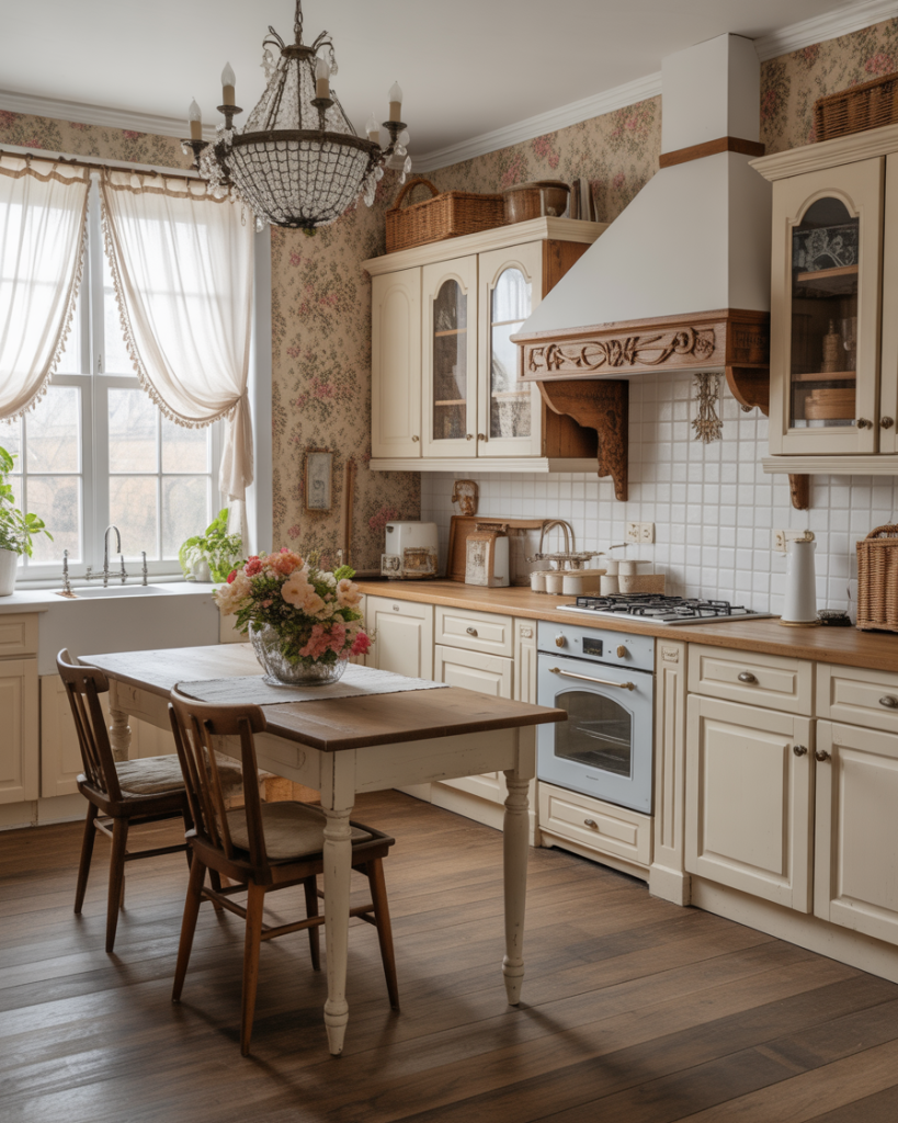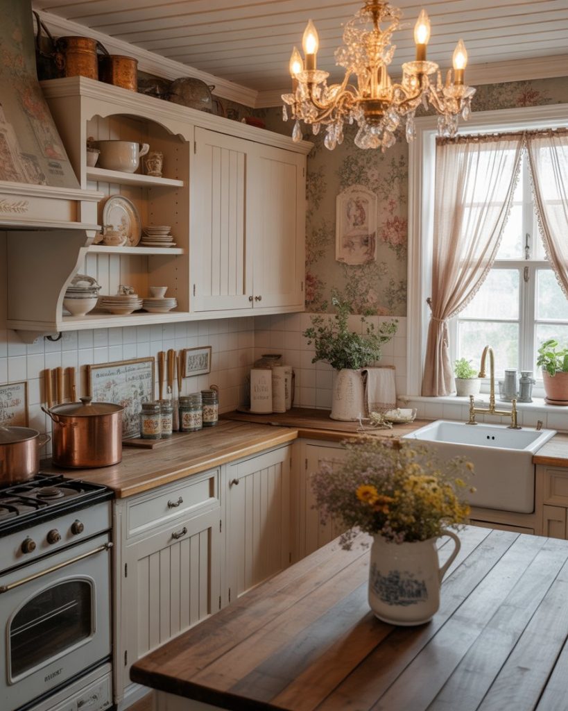 A cottage farmhouse with Victorian influence brings gentle nostalgia to the kitchen. Off-white cabinetry, ornate handles, floral wallpaper, and a vintage chandelier create soft elegance. The look is quaint but full of depth—part rustic, part heirloom. It’s perfect for those who treasure family antiques or love a layered, timeworn look. Cozy, romantic, and detailed, this style invites you to slow down and savor every cup of tea at the kitchen table.