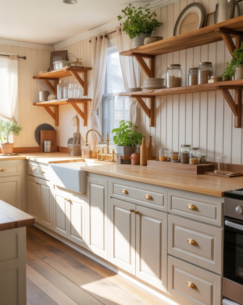 A budget-friendly rustic makeover proves style doesn’t require extravagance. Repaint existing cabinets in soft white, change hardware to brushed brass, and add open shelving from reclaimed wood. Beadboard backsplashes and modern lighting transform the space affordably. These simple updates refresh any kitchen while preserving its farmhouse soul. This idea suits renters or first-time renovators who want a big impact with minimal spending.