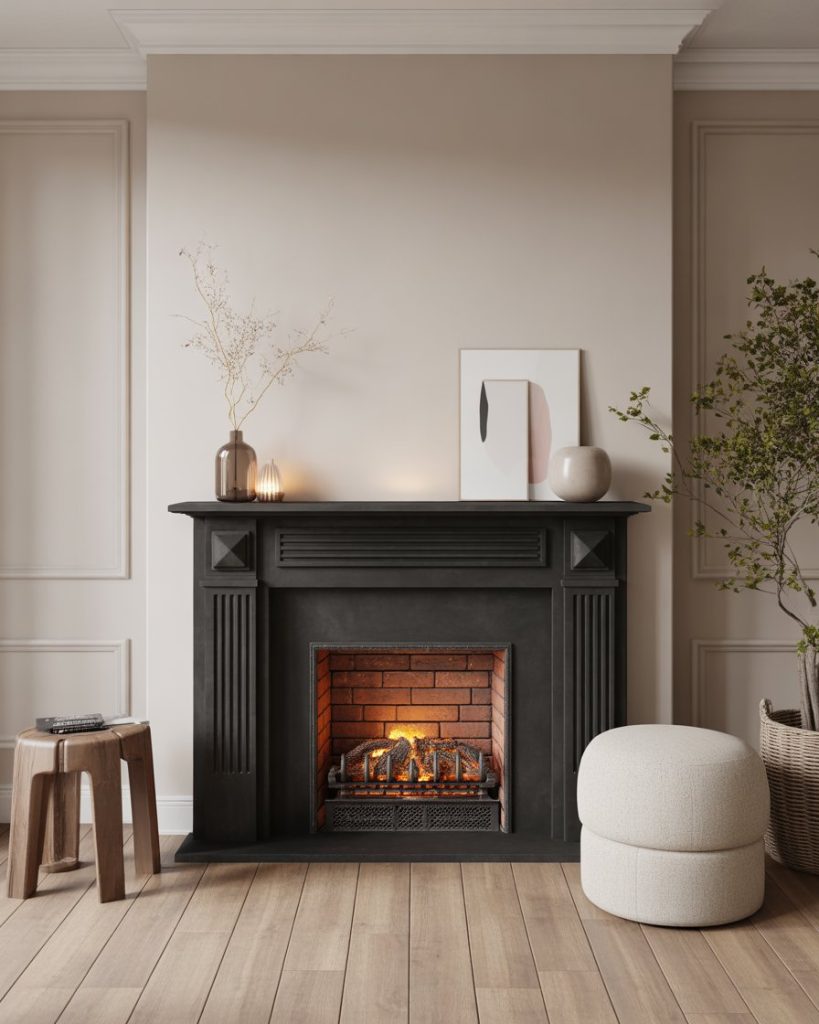 A sleek black fireplace instantly creates a modern, elegant vibe. Designers note that dark tones highlight the flame glow and work beautifully in eclectic spaces where textures and shapes do the talking. You can add subtle accents like slim metal candle holders or small sculptures on top of the mantel for balance. This idea works especially well in urban living rooms where clean lines are desired.