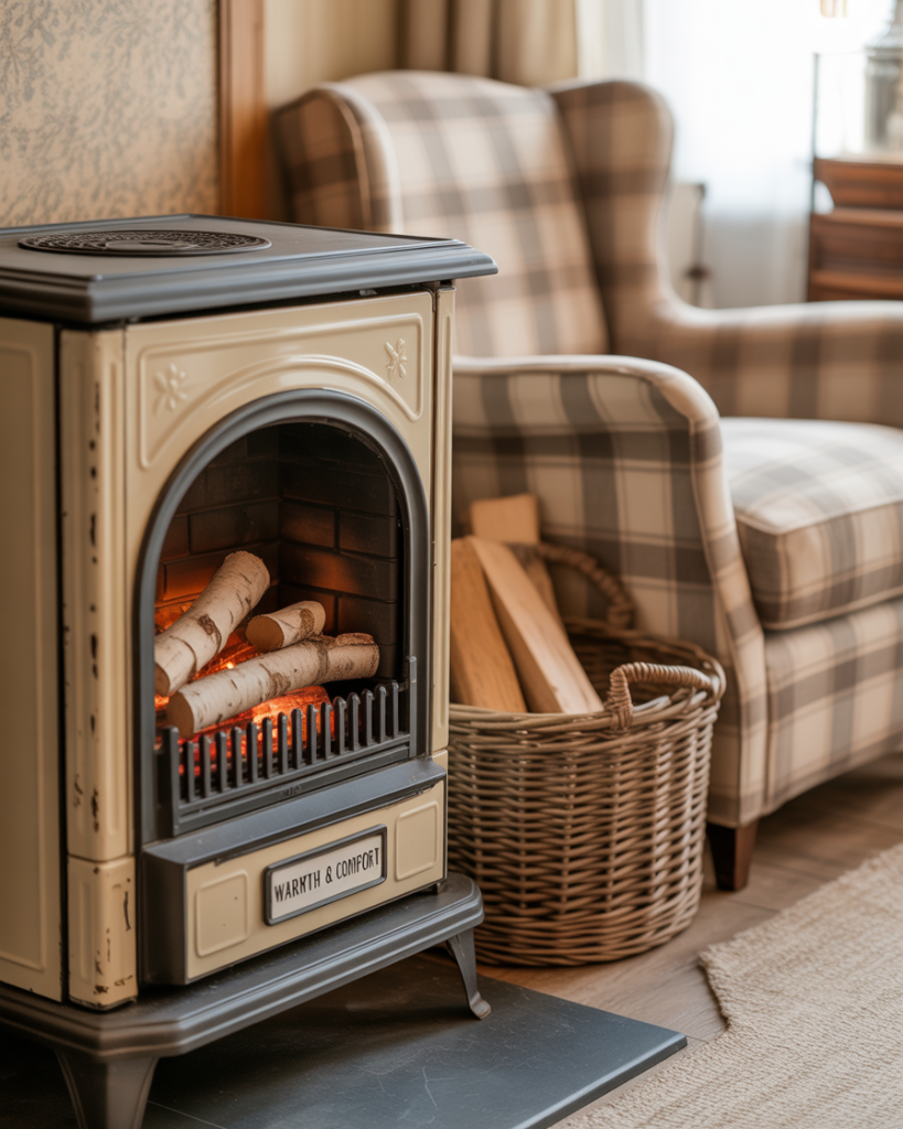 Finally, the electric stove is making a comeback as a charming small-space solution. Perfect for cottages or a bedroom with limited space, these units mimic the feel of a classic wood stove without the hassle. Style them with woven baskets and a soft armchair placed at the side of the unit. It’s a nostalgic, comforting choice that works in both rustic and modern settings.