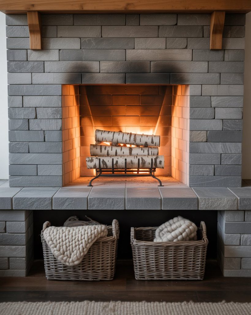 The bottom of the fireplace can be a clever storage zone. Built-in cubbies for logs, decorative baskets, or even books bring functionality and style together. This works especially well in smaller living rooms or a bedroom with limited space. It’s a practical way to highlight the fireplace while keeping clutter under control.
