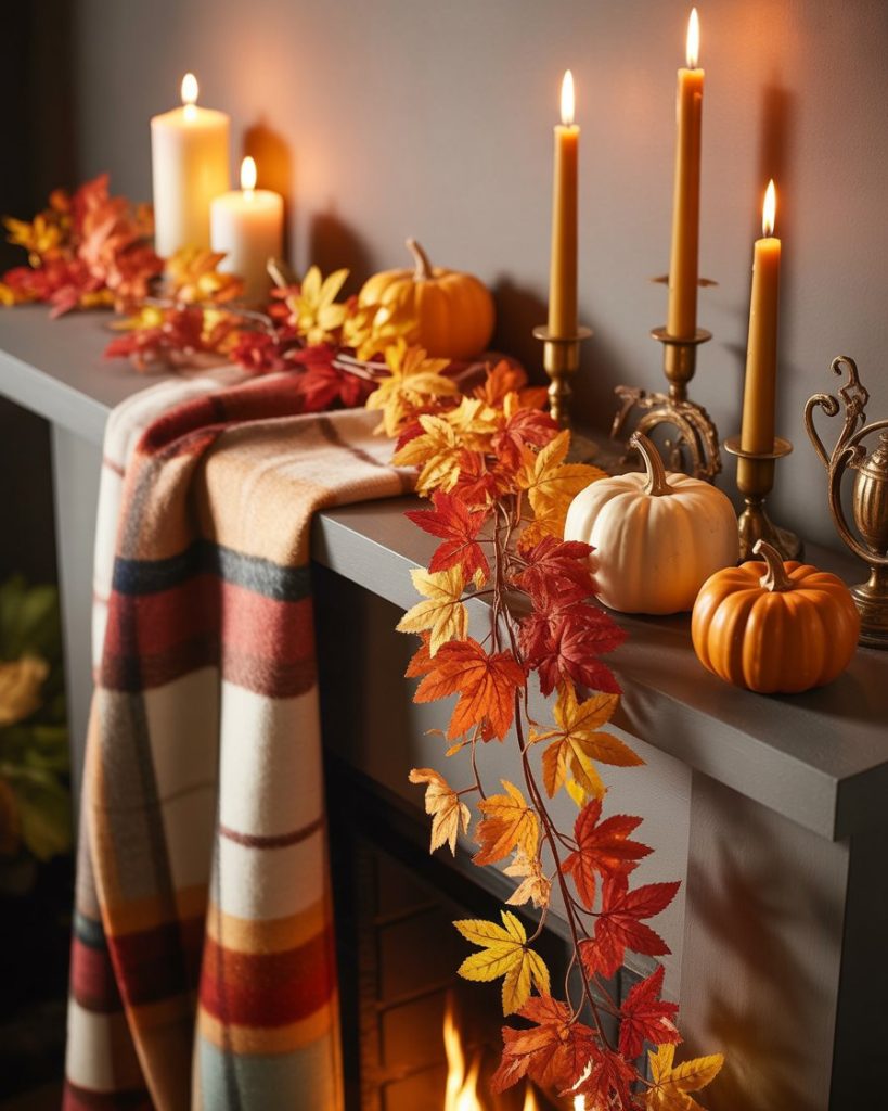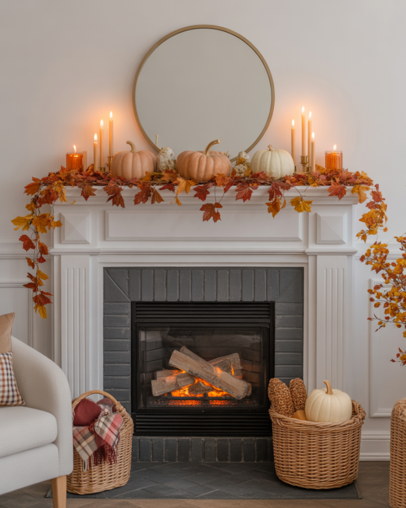 Decorating the fireplace for autumn makes the whole home feel warmer. Think pumpkins, leaves, and amber candles spread across the top of the mantel. Many decorators suggest layering textures like plaid throws nearby for extra coziness. Even an unused hearth can shine with a seasonal arrangement inside.