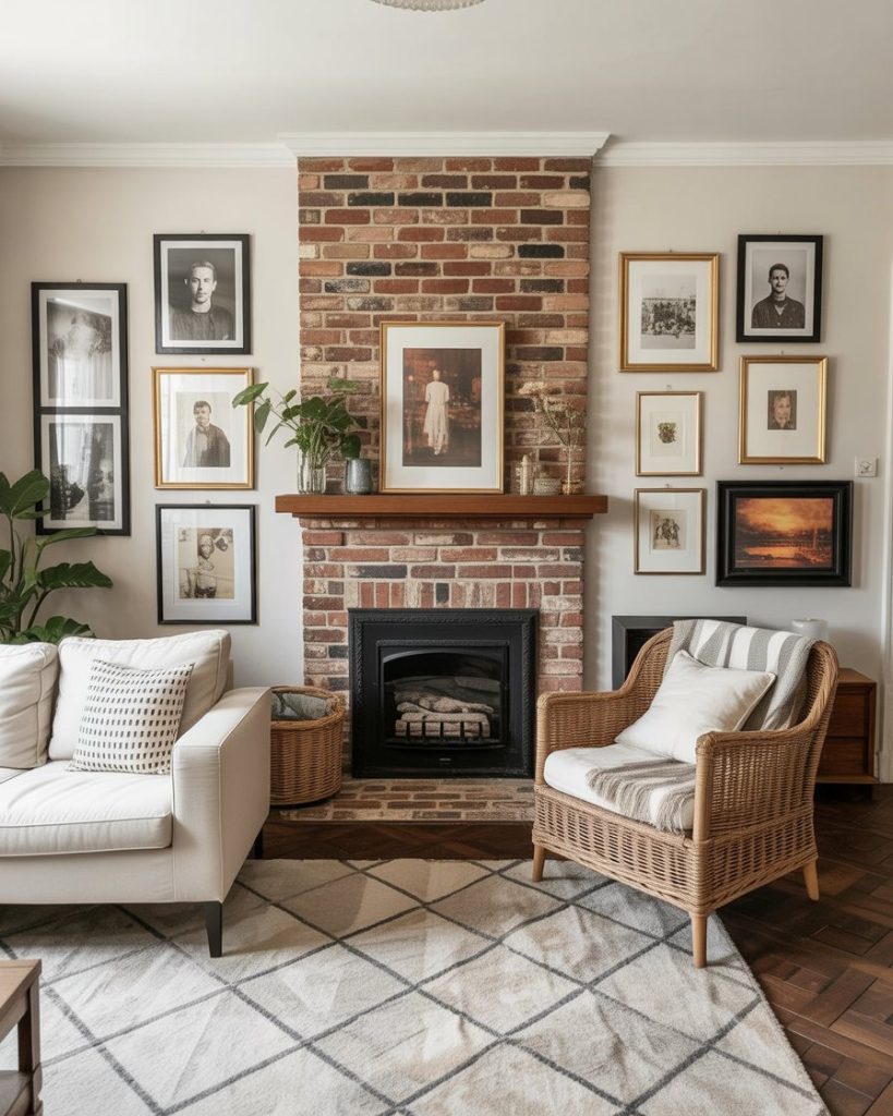 Creating a gallery wall on the side of the fireplace gives the area fresh personality. Family portraits, abstract art, or black-and-white photography look striking against stone or red brick. It’s a stylish way to make the fireplace area a focal point without crowding the front of the hearth.
