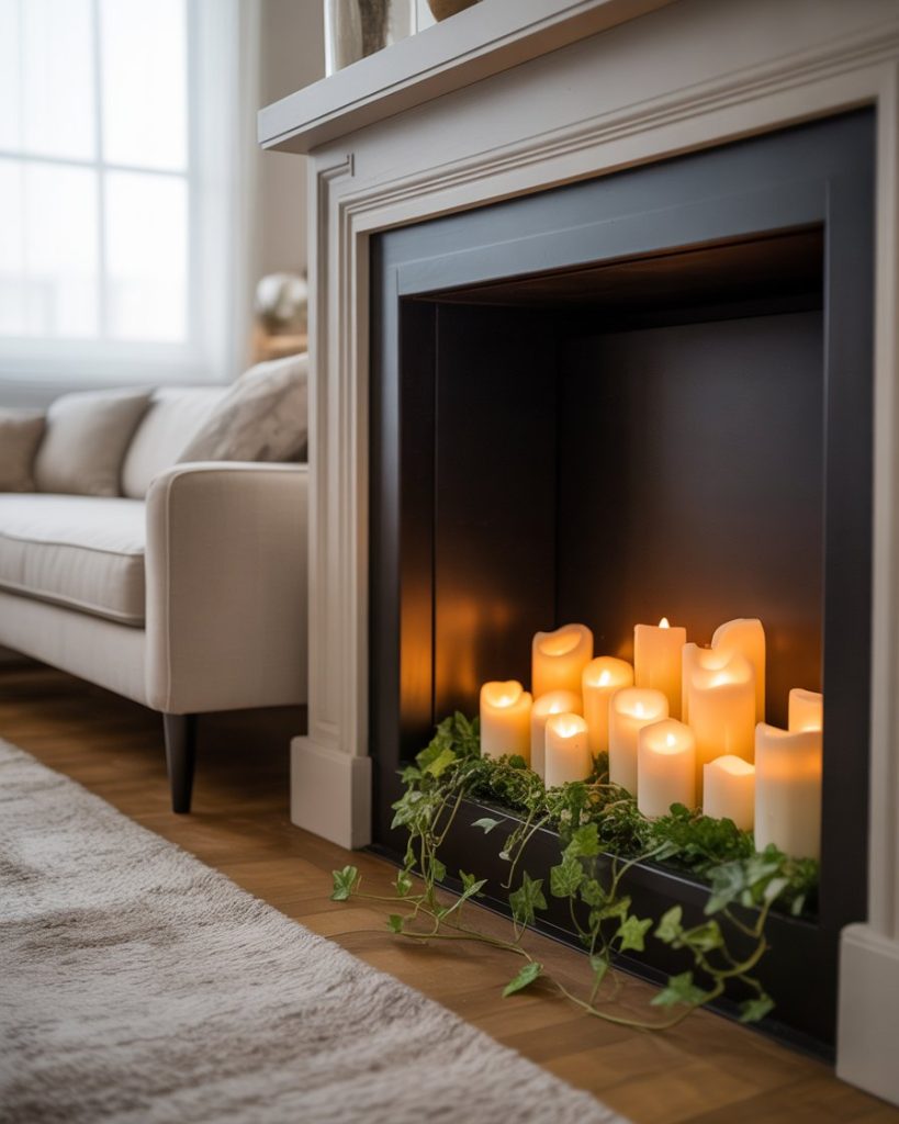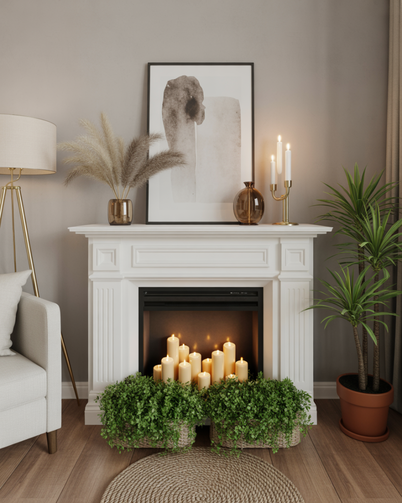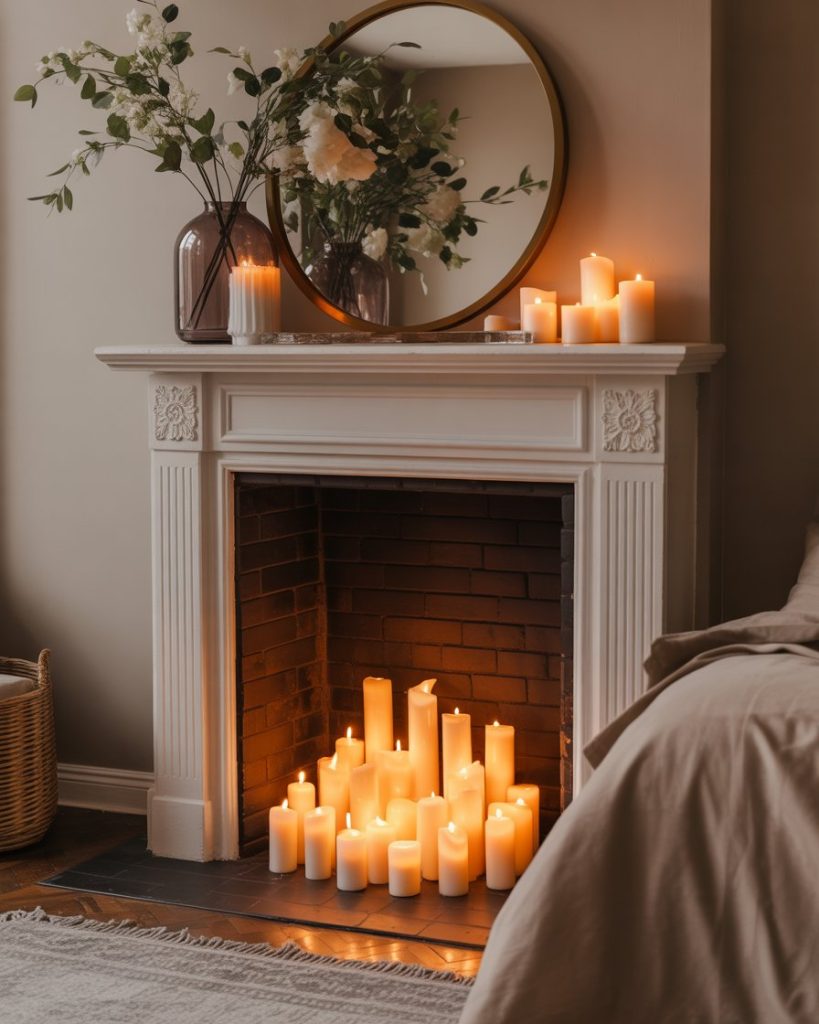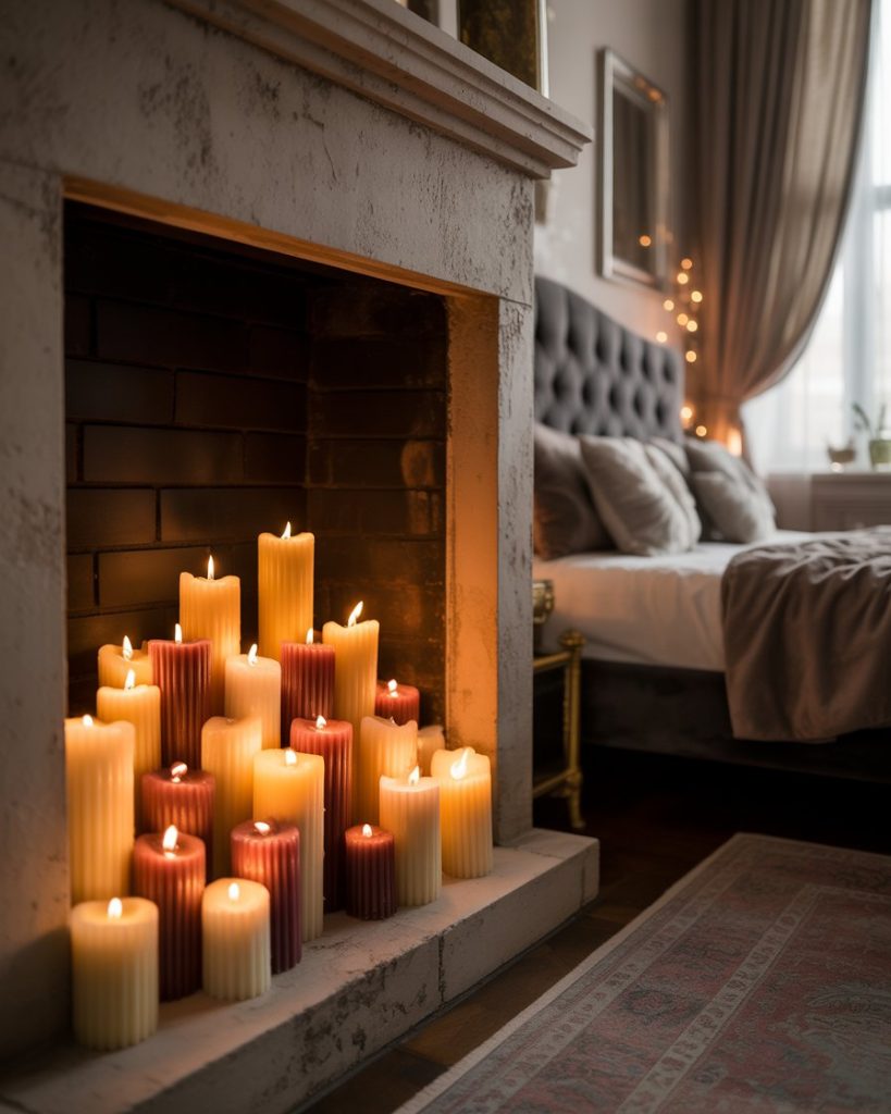 For unused fireplaces, filling the inside with large candles creates a soft, romantic glow. Arrange them in varying heights for depth, or use LED versions for safety. This works equally well in living rooms or a bedroom with a non-functional hearth. It’s a fake flame solution that keeps the cozy feel alive.