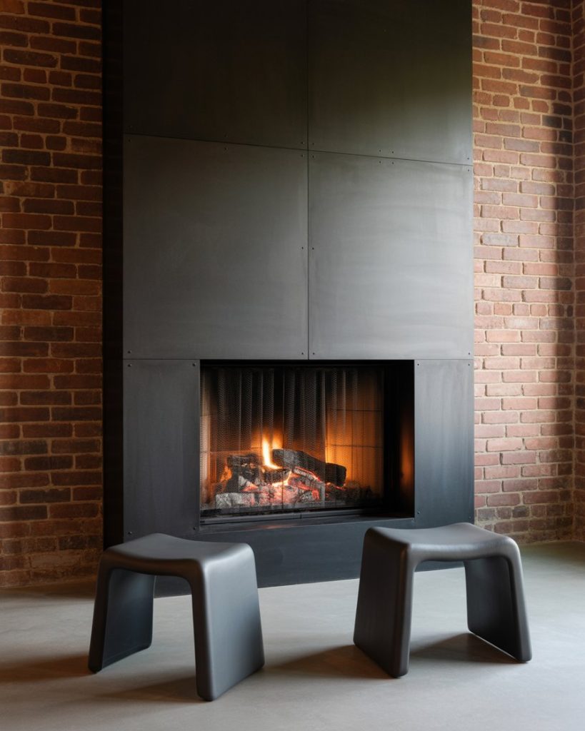 A fireplace with a steel frame or concrete finish delivers bold industrial appeal. Pairing a black metal surround with exposed beams or brick walls emphasizes urban style. This idea suits loft apartments and eclectic spaces, especially when a few sleek stools are placed at the front of the hearth.
