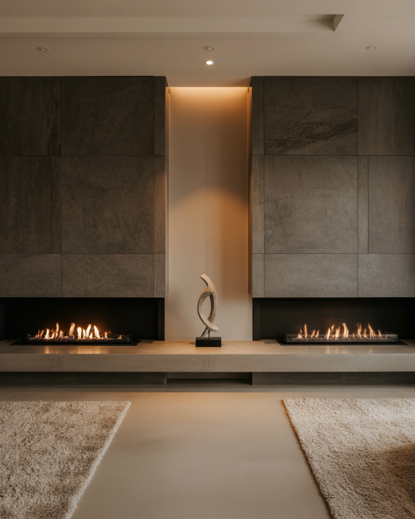 A two-way fireplace lets the flame be enjoyed from both sides—perfect for living rooms that open into dining areas. Decorators in 2026 are styling these with clear mantels or minimal accessories so the focus stays on the fire itself. Adding a rug at the bottom of each side enhances the cozy vibe without overcrowding.