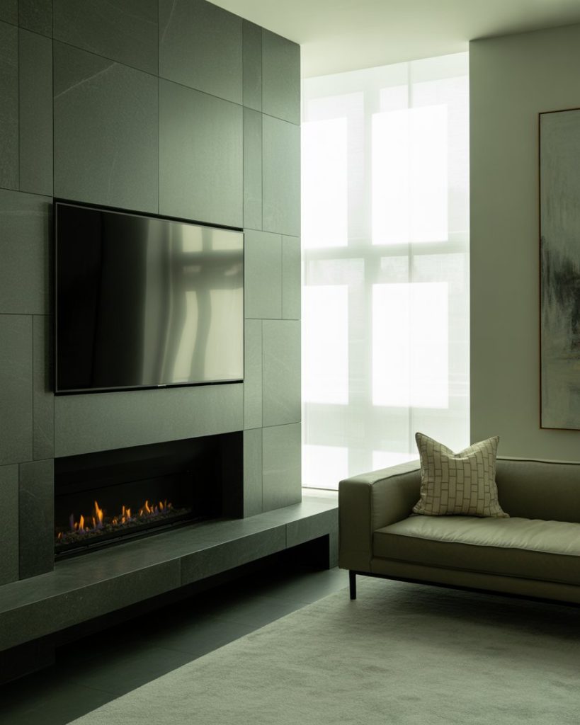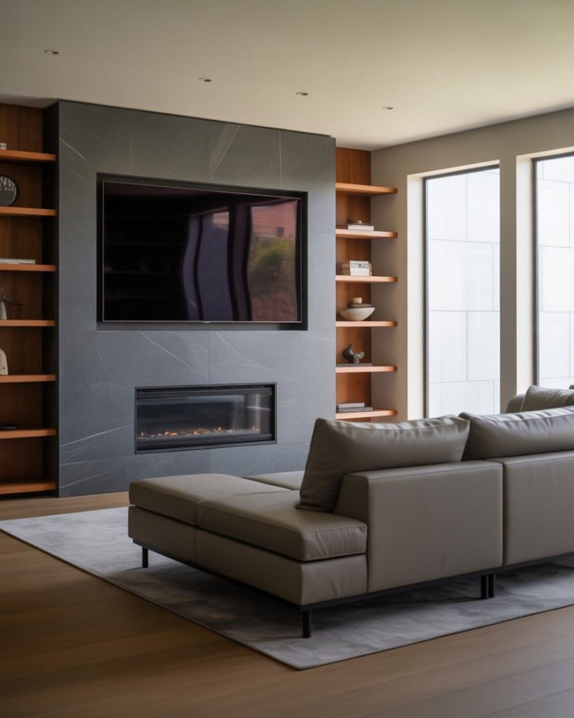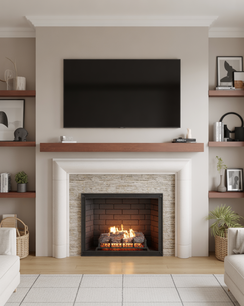 Some 2026 designs ditch the mantel altogether for a streamlined look. A stone or faux surround without shelves emphasizes clean lines. This works especially well when paired with a mounted TV or large-scale artwork above. It’s a strong fit for minimalist and contemporary living rooms.