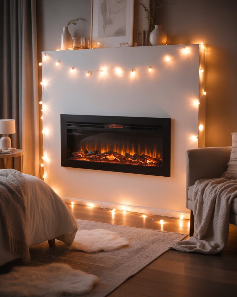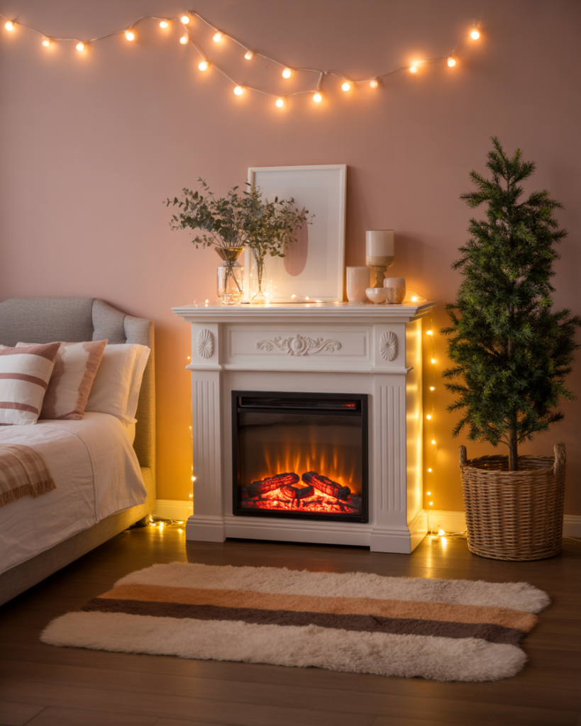 Adding a fireplace to a bedroom with soft textiles creates a sanctuary feel. Whether electric or faux, the flames bring warmth and calm. Draping fairy lights along the top of the unit enhances intimacy, while layered rugs at the bottom of anchor the space. Designers note this is one of 2026’s top splurge-worthy upgrades.