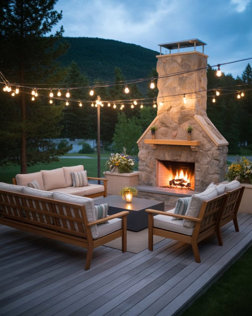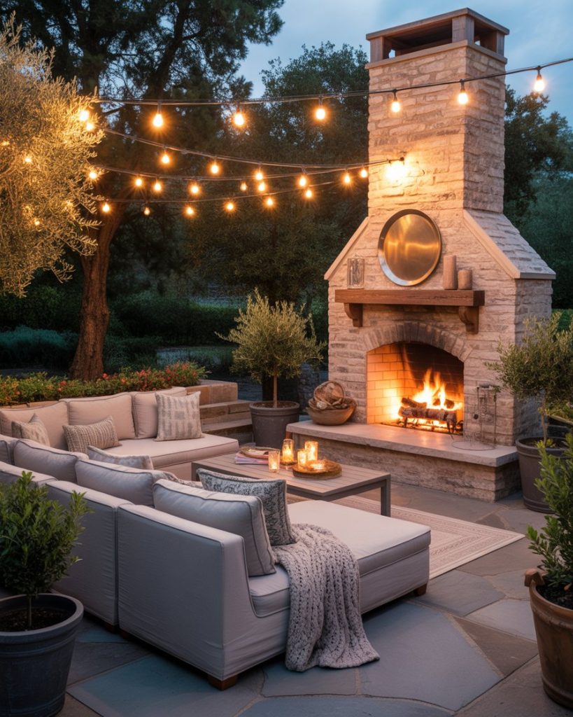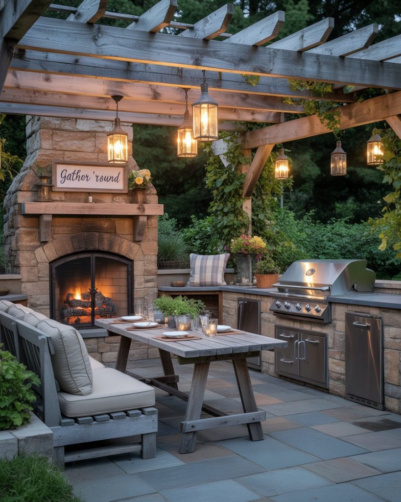 Combining an outdoor fireplace with a built-in grill or kitchen setup turns patios into year-round entertaining hubs. Stone or brick materials keep it durable, while decor accents like lanterns and rustic wood seating tie the space together. A small electric stove nearby can extend the vibe into cooler months.