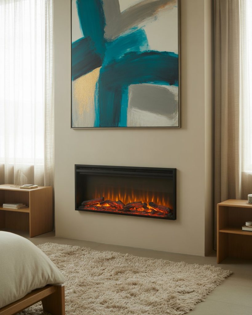 An electric fireplace is no longer just a practical solution—it’s become a style statement. These units are easy to install inside apartments or smaller homes and often come with customizable flame colors. They’re perfect for a modern bedroom with a minimalist aesthetic. Add framed artwork above and a soft rug at the bottom of the unit to balance tech with warmth.