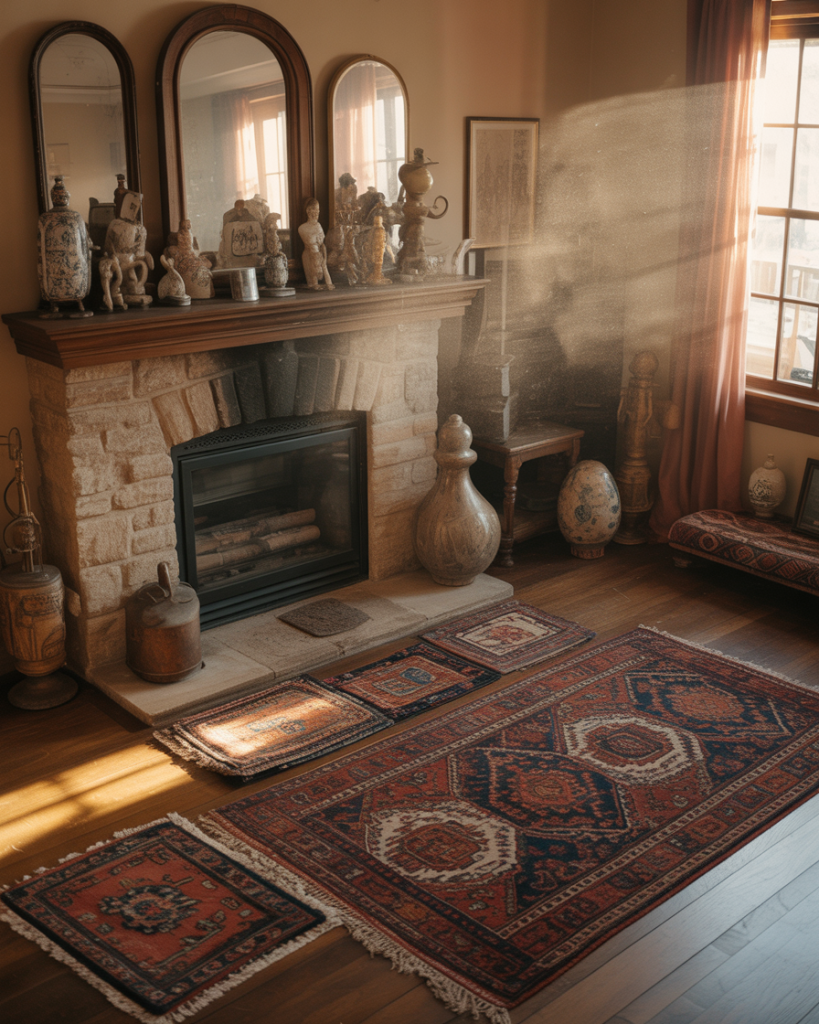 An eclectic approach means layering unexpected objects across the top of the mantel—think vintage mirrors, travel souvenirs, or even quirky ceramics. The goal is personality over perfection. This is particularly fun in living rooms that already have colorful rugs or art. Try anchoring the display with a large mirror, then balance smaller items along the side of it for symmetry.