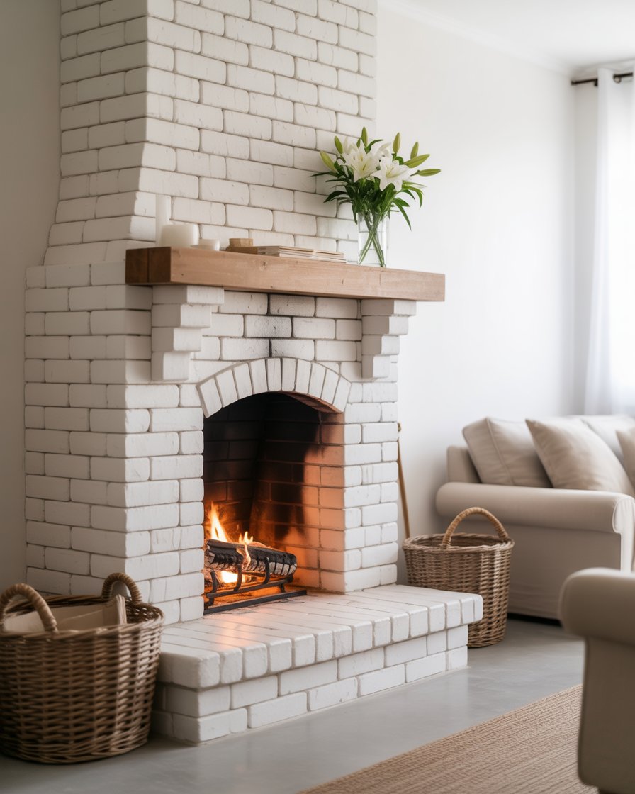 A white fireplace creates a fresh, airy mood that fits coastal or farmhouse styles. Whitewashing brick or stone makes the texture stand out without overwhelming the room. This look works beautifully in modern living rooms, especially when paired with light furniture and neutral tones. Adding woven baskets at the side of the hearth adds depth and a natural feel.