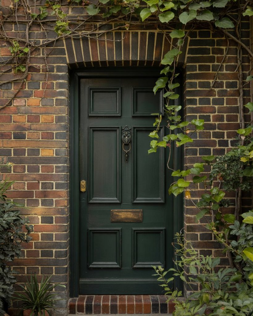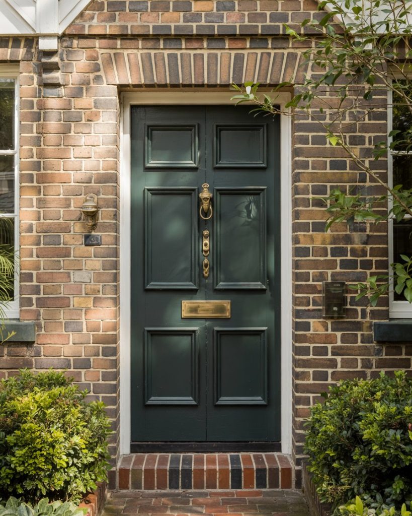 A deep forest green door feels timeless and organic on a brown brick house. The rich, earthy tone enhances the brick’s warmth and gives the exterior a refined yet welcoming appeal. Designers predict natural greens will dominate 2026 palettes, bringing a grounded calmness to homes that value tradition and nature. This color pairs beautifully with brass hardware and a classic wreath for a sophisticated touch.