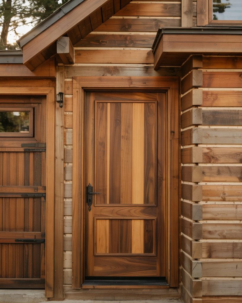 For a rustic garage and log cabin exterior, a warm walnut-stained door highlights the natural grain of the wood while harmonizing with its earthy surroundings. This trend reflects 2026’s love for authenticity and organic finishes. The look feels cozy, timeless, and perfectly suited for cabins or homes with wooden façades. [ID38]