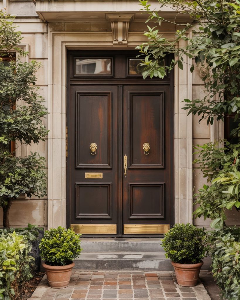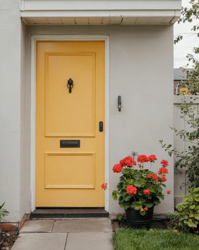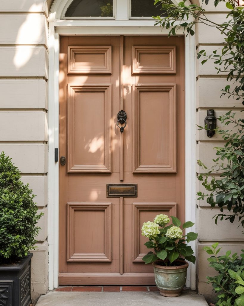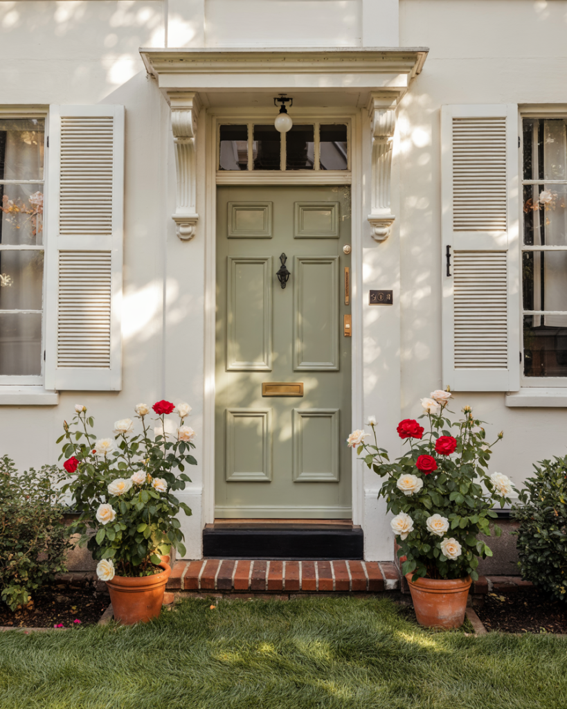 A beige house looks effortlessly warm when complemented by a muted terracotta front door. Inspired by Mediterranean tones, terracotta brings depth and authenticity to a neutral palette. Designers highlight these earthy hues as part of 2026’s shift toward grounded, sun-baked colors that connect homes to nature.