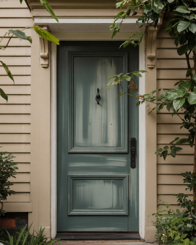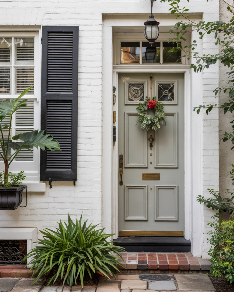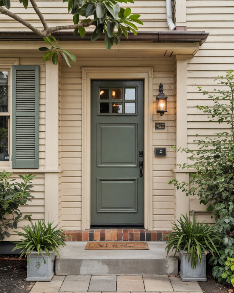 Pairing a soft olive green front door with a light gray house creates a peaceful and organic feel. Olive is versatile and soothing, perfectly bridging warm and cool tones. Designers note that 2026 will celebrate natural greens like this, ideal for homeowners who want subtle sophistication and harmony with landscaping.