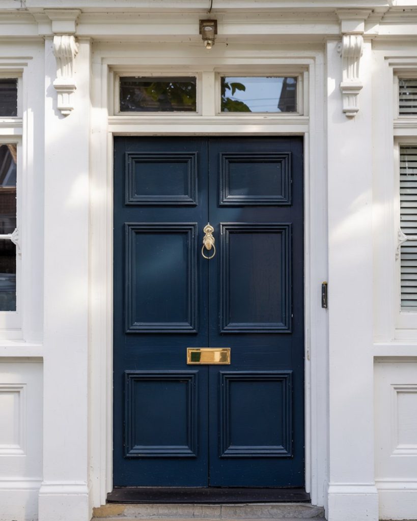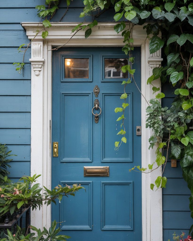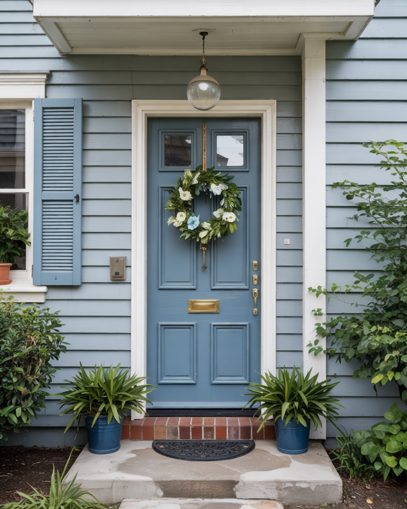 Pairing a slightly deeper blue house exterior with an ocean-blue door might sound subtle, but layering blues adds dimension and coastal charm. It evokes the calmness of seaside living and works perfectly in neighborhoods where nautical or cottage styles are popular. This tonal approach will stay strong in 2026, according to designers embracing “tone-on-tone” exteriors.