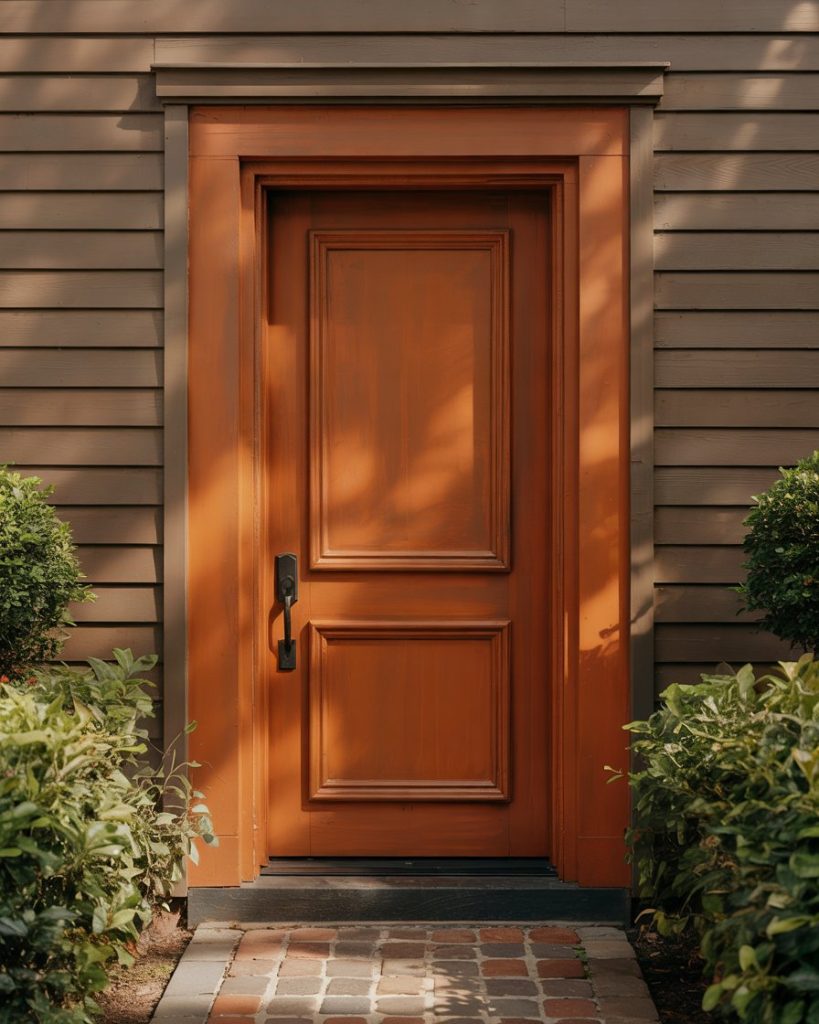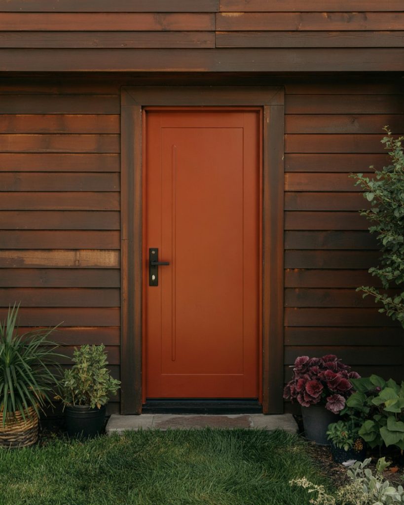 If you have a brown house, a burnt orange door can inject warmth and playful contrast. The earthy orange stands out against darker siding without clashing, creating a cozy yet adventurous look. It’s an emerging trend for 2026 that brings personality while still blending naturally with brick or stone accents.